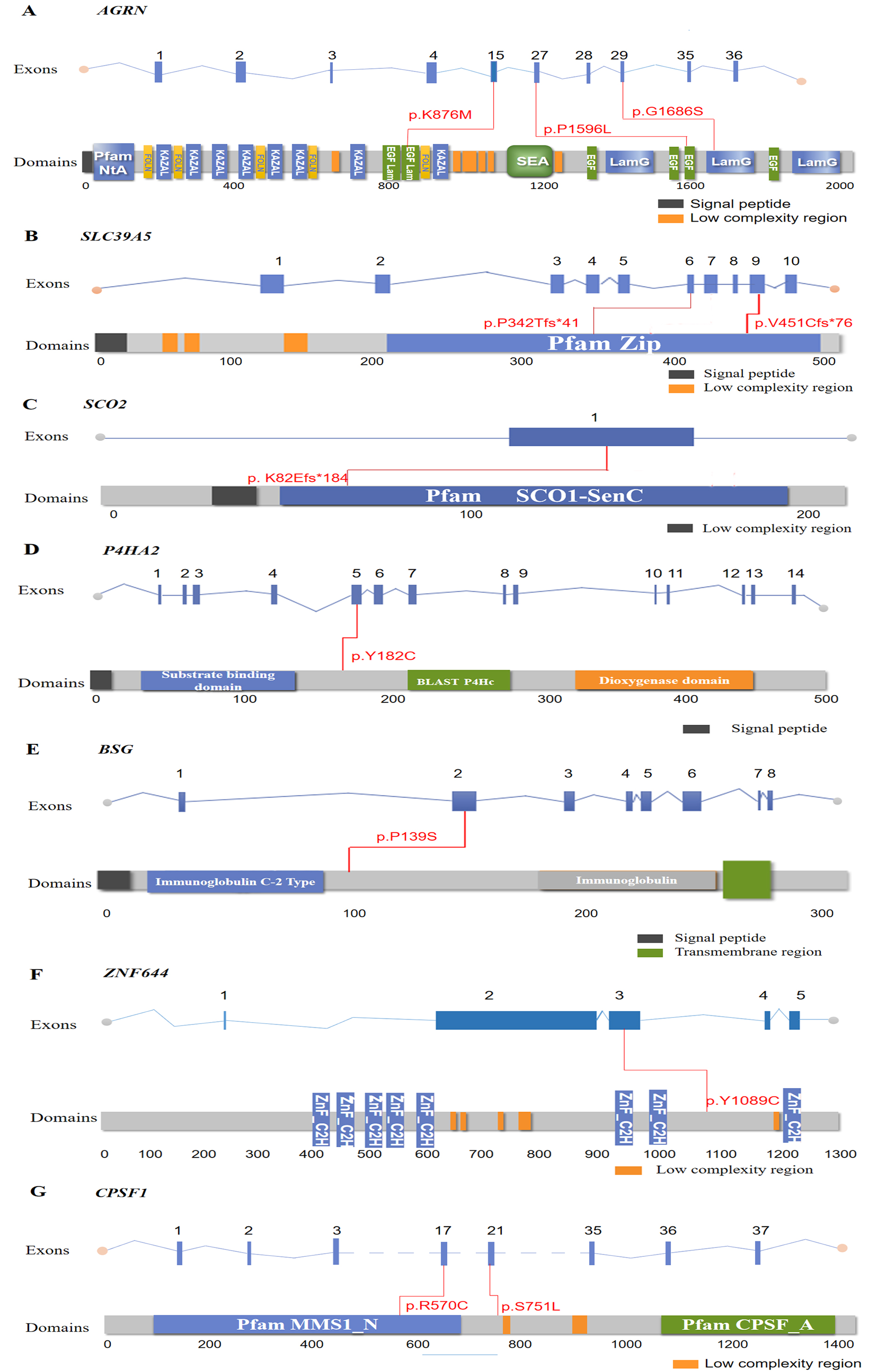 Figure 2. Location of identified variants in the AGRN, SLC39A5, SCO2, ZNF644, BSG, P4HA2, and CPSF1 genes. Exons of human AGRN, SLC39A5, SCO2, ZNF644, BSG, P4HA2, and CPSF1 (upper), and locations of mutated residues with respect to the topological model of the polypeptides (under) are shown. A