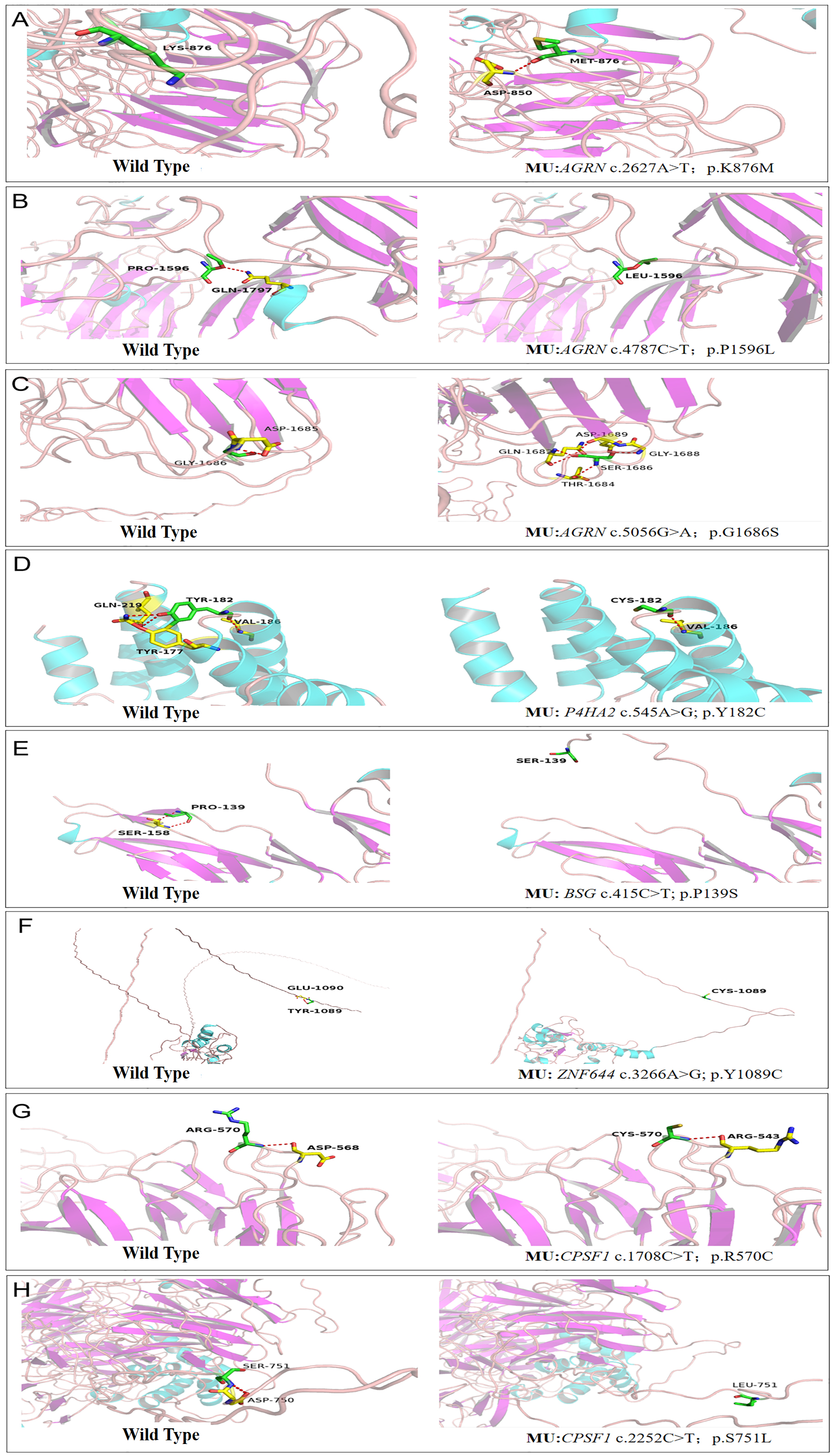 proteins. The wild-type (left) and mutant (right) residues are green, while the residues that bind with them are yellow (A–H).