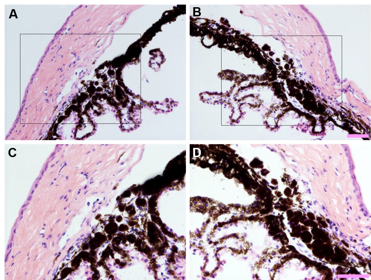 To access the data, click or select the words “Appendix 9.” Persistence of clump cells in the iridocorneal angle of eyes following intraocular Ad5 injection. Light micrographs collected from opposite poles (left vs. right column) of hematoxylin and eosin-stained histological sections from the same eye shown at (A–B) 200X and (C–D) 400X total magnification. Areas within inset boxes (top row) are show at higher magnification below (bottom row). Note that despite some variability, there is a persistent localization of clump cells deep within the iridocorneal angle with proximity to the drainage structures. Scale bar = 50 µm.