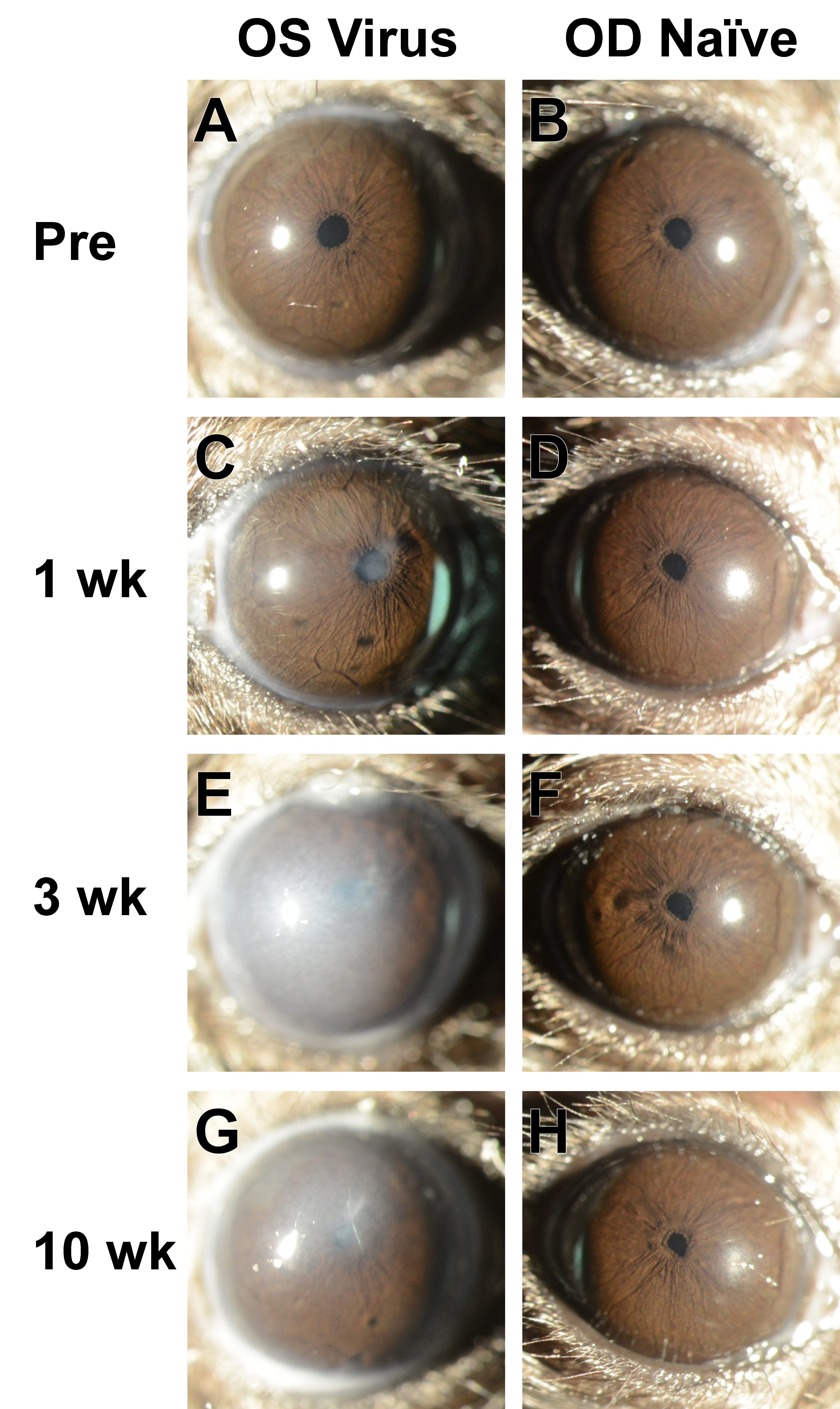 G-H: At the 10-week time point, the corneal opacity in the injected left eye shows lessened severity, and where areas of the
