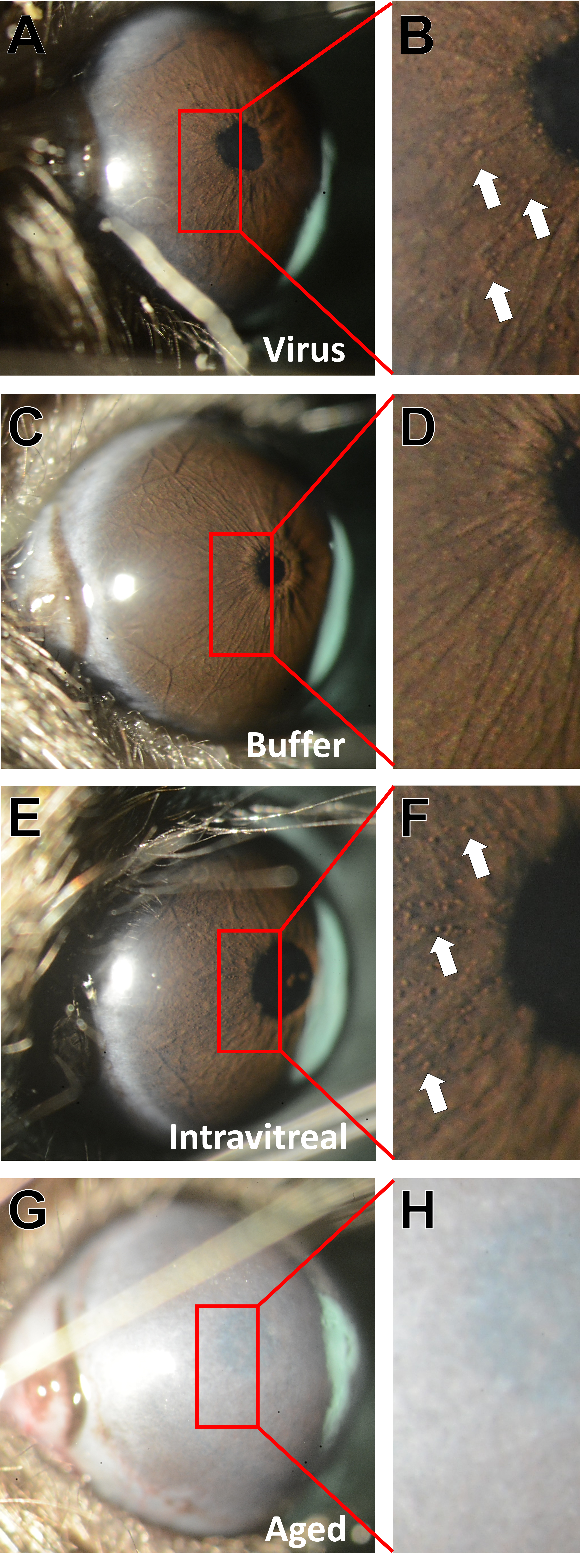 G-H: The eyes of the mice in the Aged group that received an intraocular injection of Ad5 all had corneal cloudiness at the 10-week