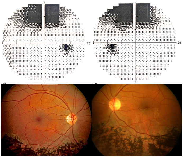 Figure 2. 30–2 visual field testing and corresponding color retinography in both eyes in patient 13. The visual field shows superior