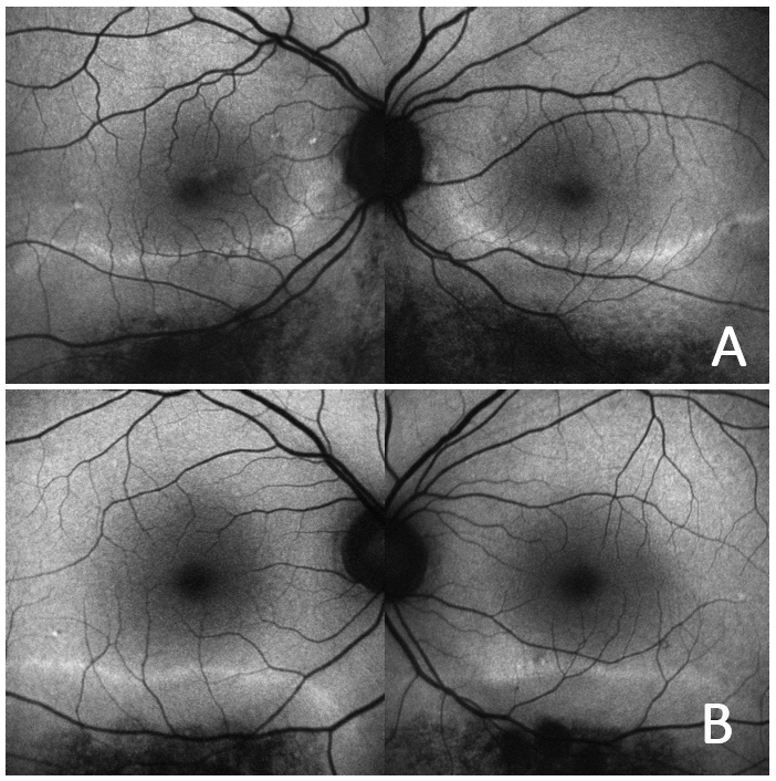 Fundus autofluorescence imaging. The images show the demarcation line of hyper-AF in the affected quadrant in patient 1 (