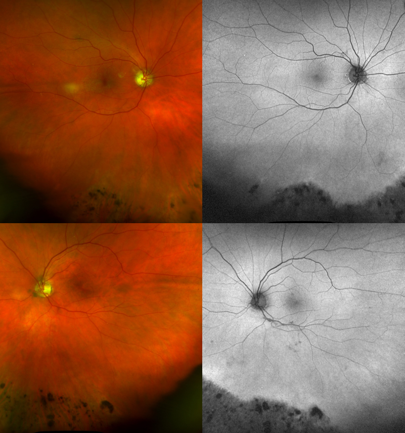 Widefield retinography and fundus autofluorescence imaging. The images show inferior pigmentary changes in the very periphery in patient 15.