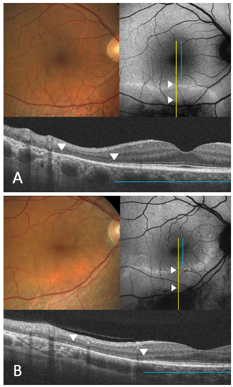 Figure 8. Fundus autofluorescence and OCT imaging. The images are referred to patient 2 (A) and patient 1 (B). The yellow line indicates the vertical OCT scan line passing through the hyper-AF demarcation line while the blue line