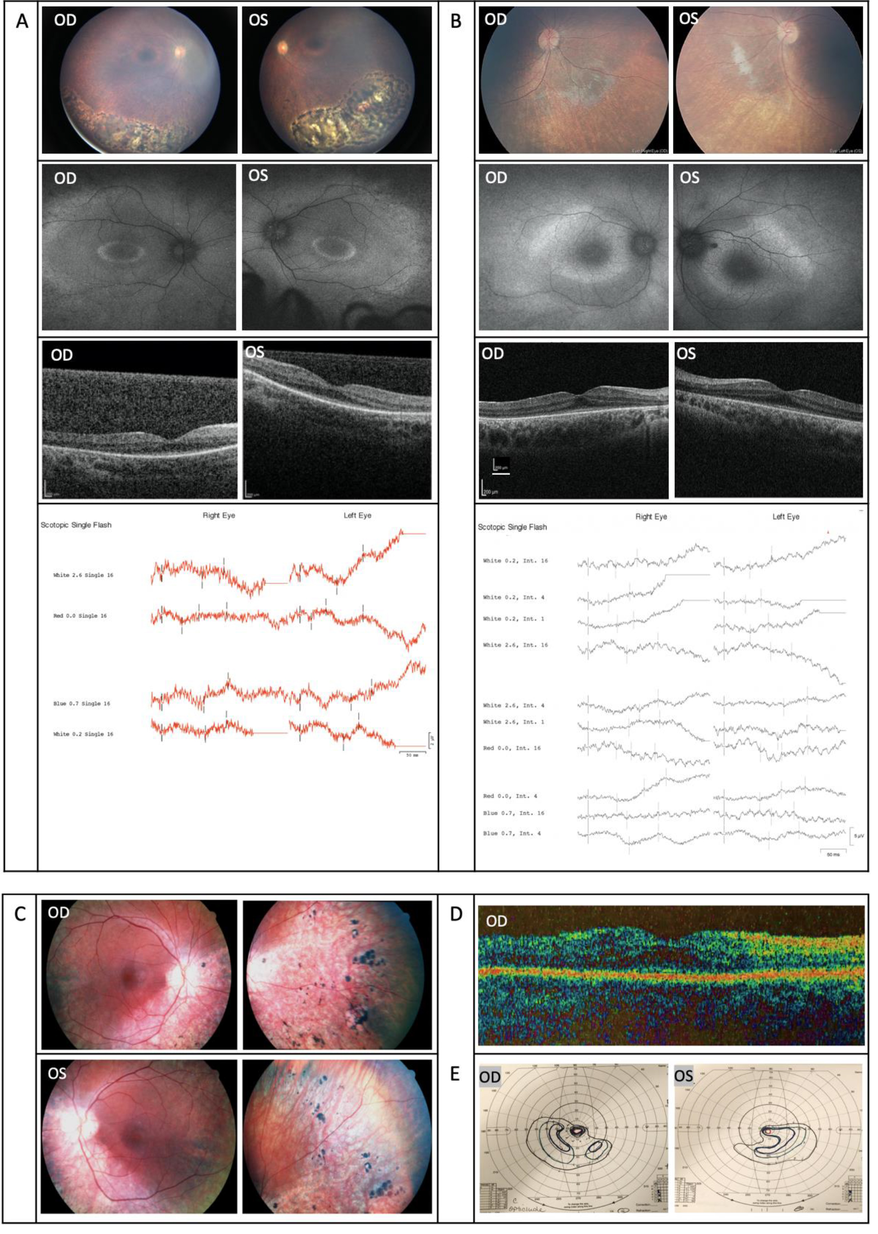 and midperiphery OU. The ffERG of patients A and B reveals severe cone and rod dysfunction. OCT imaging shows that the two