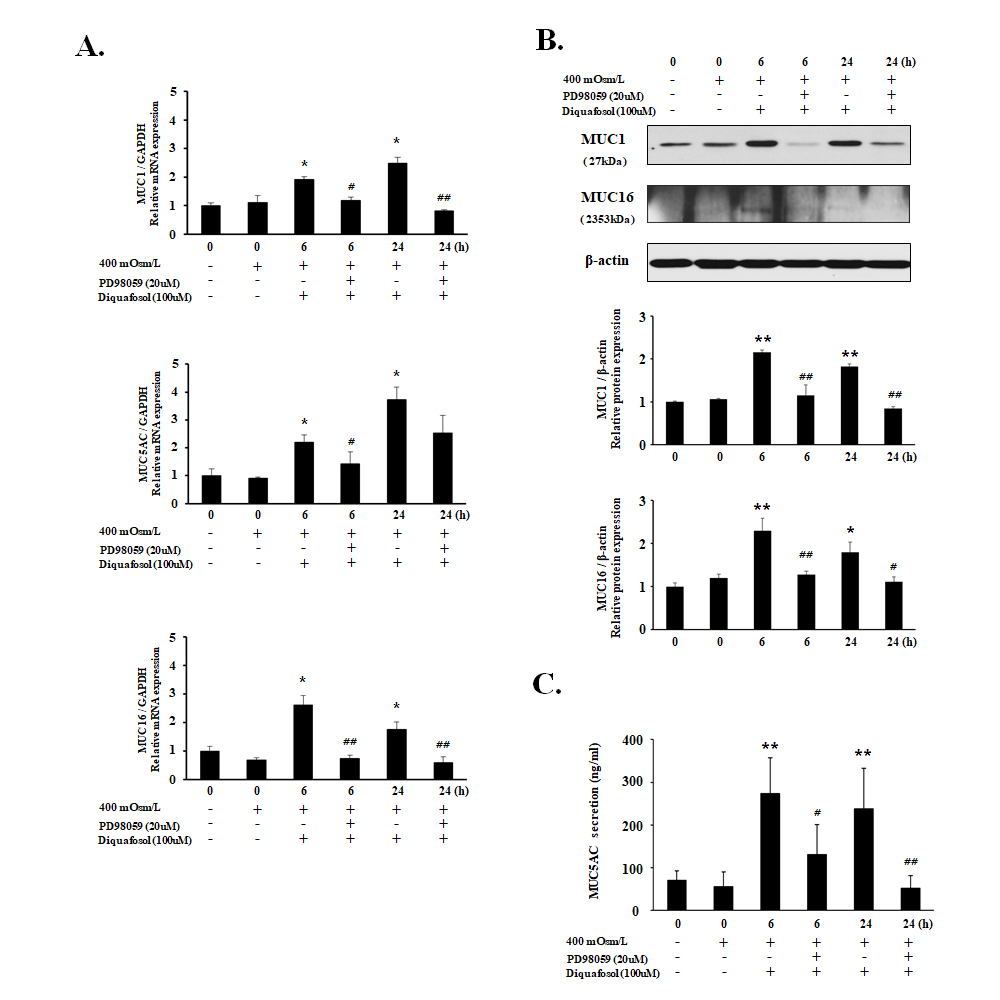Figure 4. ERK signaling regulates mucin expression enhanced by diquafosol tetrasodium in HCECs. A: Inhibition of MUC1, MUC16, and MUC5AC mRNA levels by ERK inhibitor. B: Representative photograph of MUC1 and MUC16 protein levels and relative expression results for both markers with ERK inhibitor.