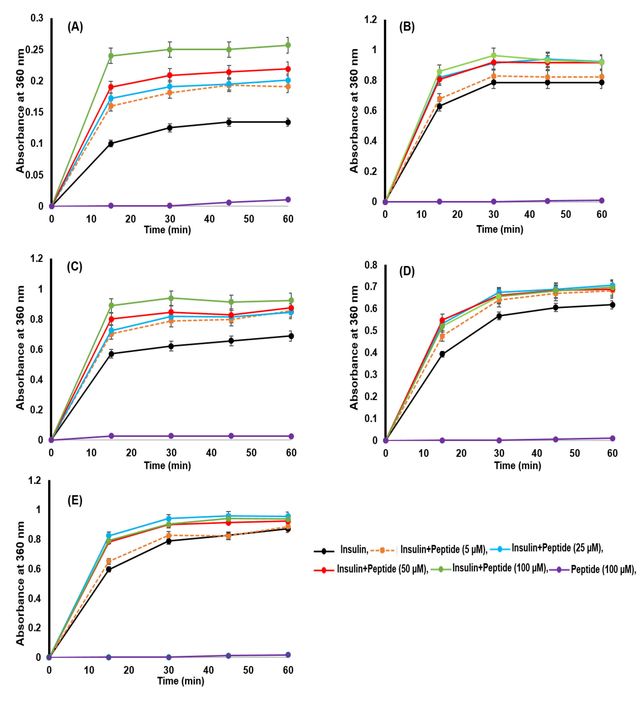 Figure 3. Determination of anti-chaperone activity of selected peptides. Antichaperone activity determination of the five selected peptides—(A) αAP1, (B) αAP2, (C) αBP3, (D) αBP4, and (E) αBP5—using insulin as the target protein. The effect of various concentrations of the peptides (5, 25, 50, and 100 µM) in