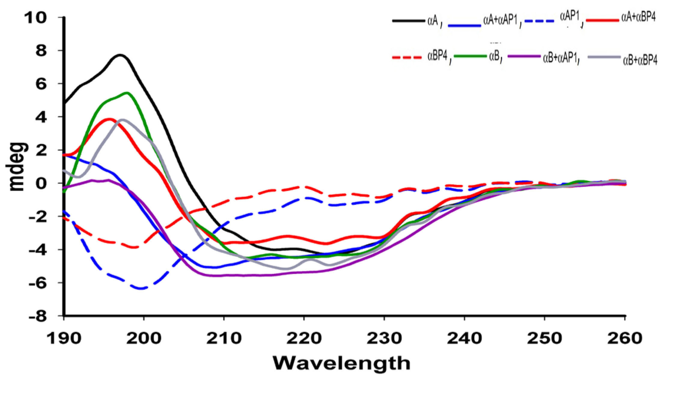 Figure 6. Determination of the effects of the αAP1 and αBP4 peptides on the secondary structure of αA- and αB-crystallins with CD spectroscopy.
