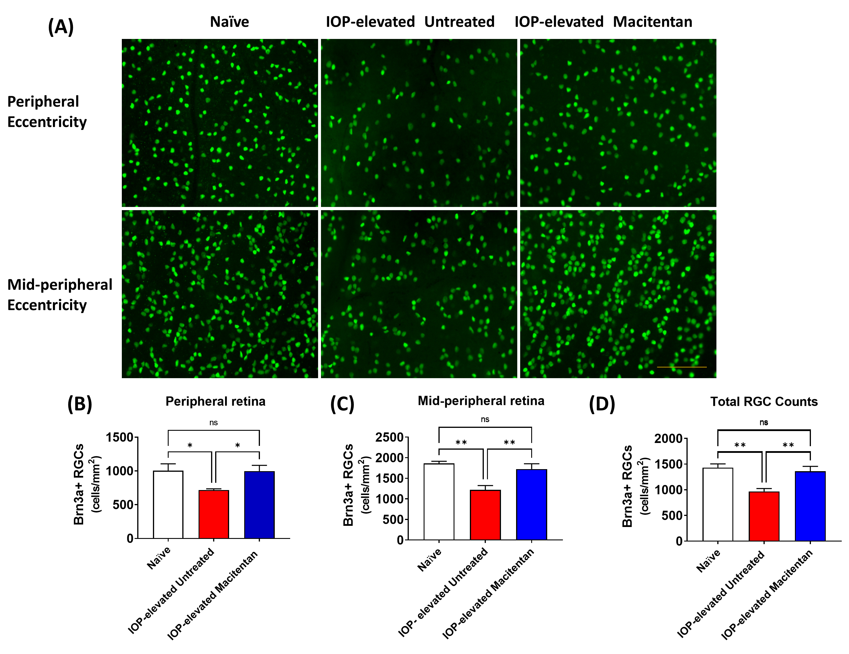 days per week for 4 weeks following IOP elevation (A). Quantitation of Brn3a-positive RGCs in naïve eyes, untreated IOP-elevated eyes, and macitentan-treated IOP-elevated eyes