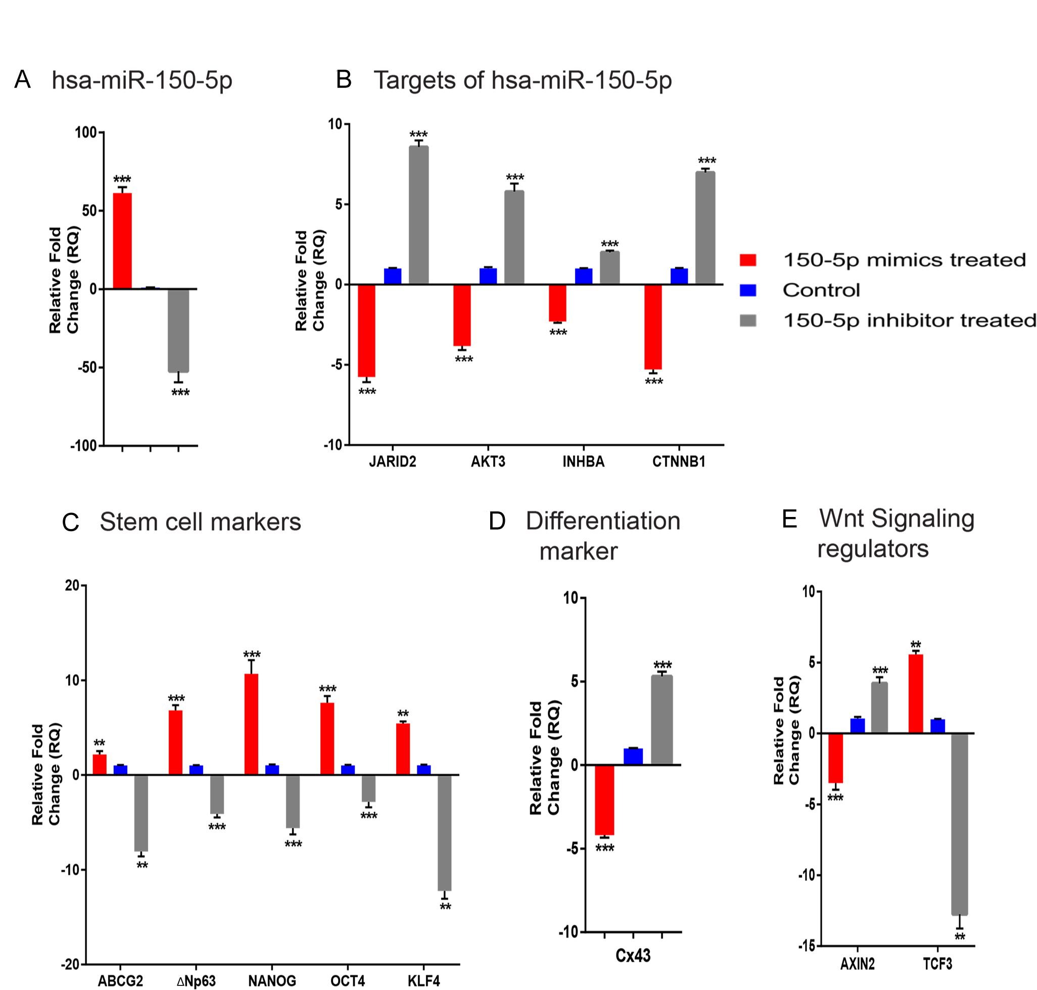 Figure 1. mRNA expression profile of hsa-miR-150-5p-transfected cells. The figure depicts the expression profiles of A: hsa-miR-150-5p, B: its predicted targets, C: the stem cell markers, D: the differentiation marker, and E: the Wnt signaling regulators upon transfection with the hsa-miR-150-5p mimic and inhibitor. The relative mRNA/miRNA expressions