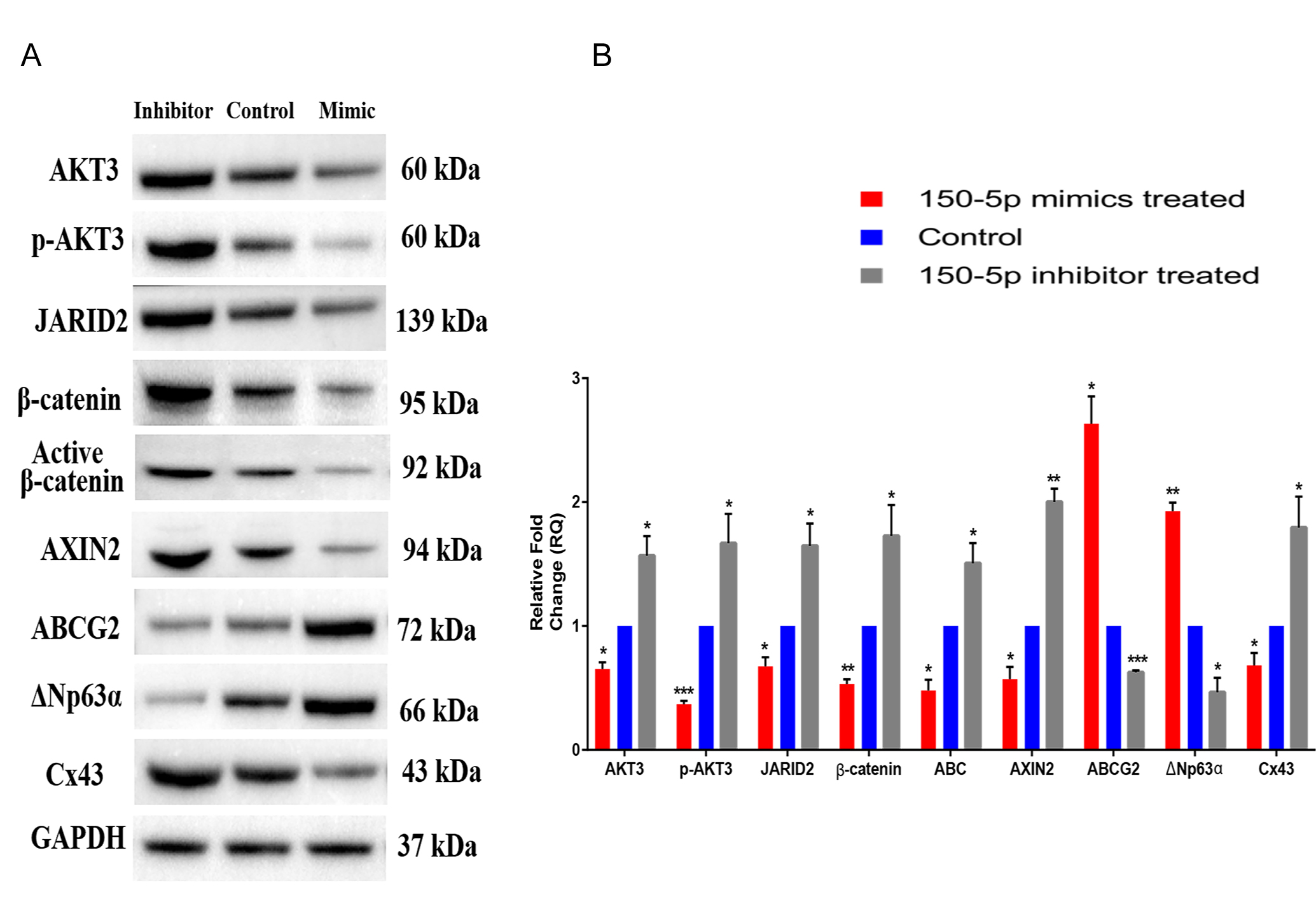 ΔNp63⍺, and Cx43) in the three groups: hsa-miR-150-5p mimic-, inhibitor-, and control-transfected RAFT cultured cells (n =