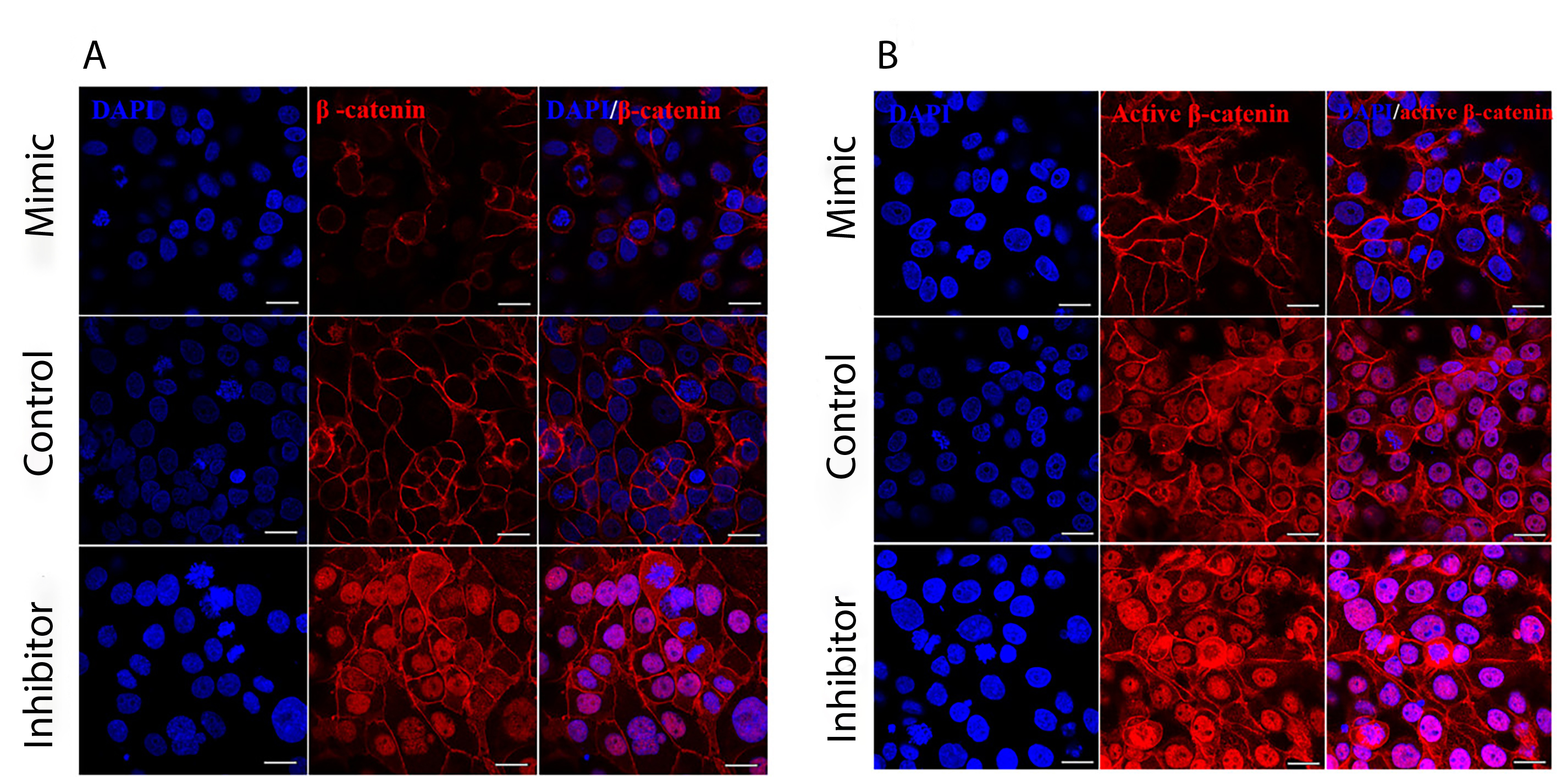for A: β-catenin and B: active- β-catenin. Nuclei were represented in blue and protein expression in red. Compared with the control- and mimic-transfected