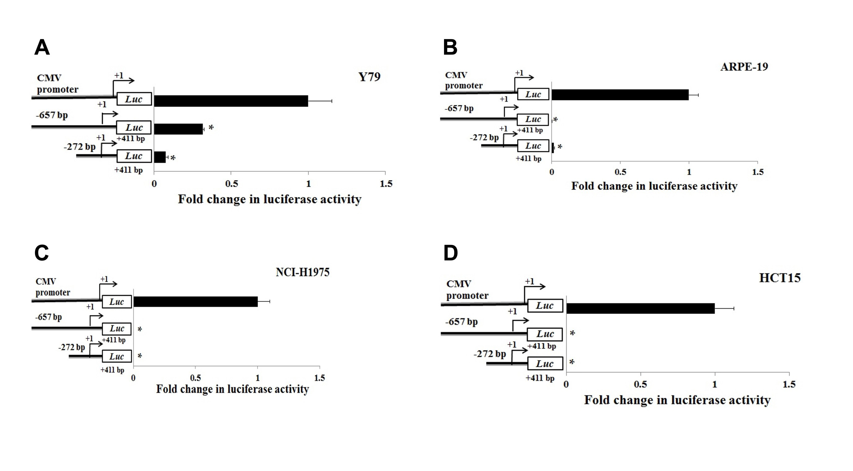 Figure 4. Analysis of DCT promoter activities using dual-luciferase assay. The activity of -657 to +411 and -272 to +411 DCT promoters was compared to CMV promoter activity in Y79 (A), ARPE-19 (B), NCI-H1975 (C), and HCT15 (D) cell lines. The bar graphs show the means and standard deviations for three independent experiments for Y79 and ARPE-19