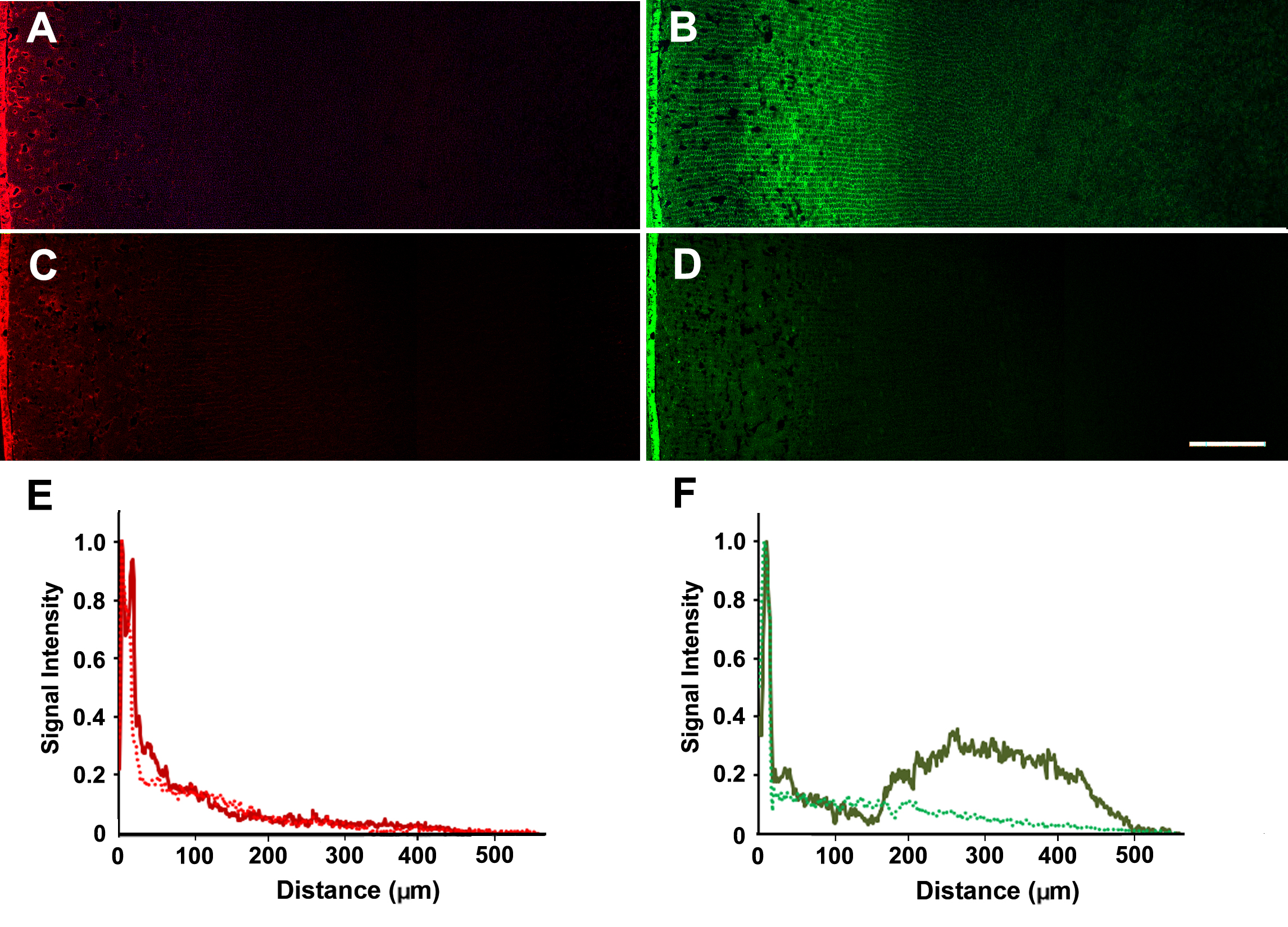 (TRD; A, C) and LY (B, D) penetration in equatorial sections from the lenses incubated for 1 h in either hypotonic AAH in the absence (A, B) or presence (C, D) of 1 mM probenecid. (E) Normalized TRD signal intensity plotted against distance into the lens taken from the lenses incubated in hypotonic AAH in