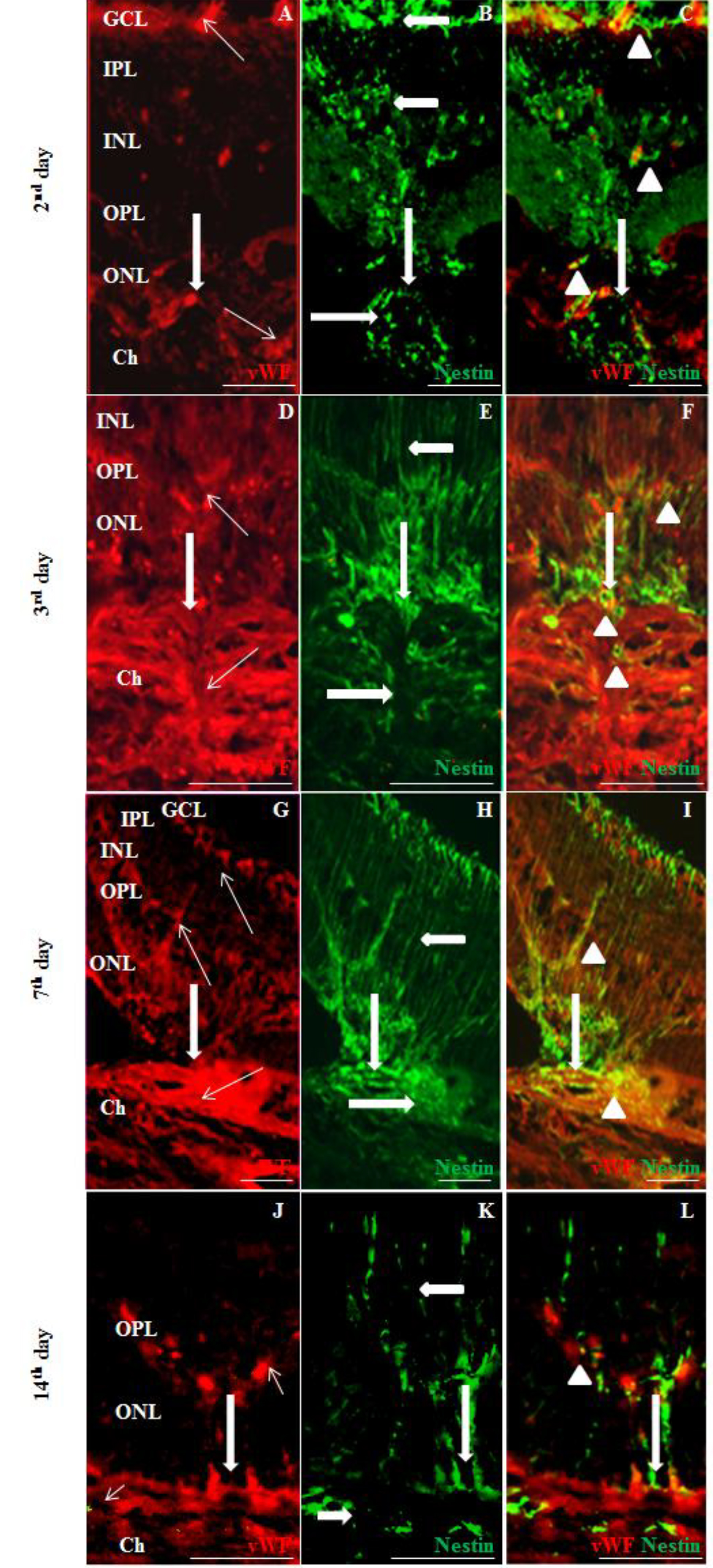 Figure 6. von Willebrand factor (vWF, red) and nestin on the second, third, seventh, and 14th days after laser impact. A: On the second day post laser impact, vWF expression was found in blood vessels in the retina (upward thin arrow) and choroid