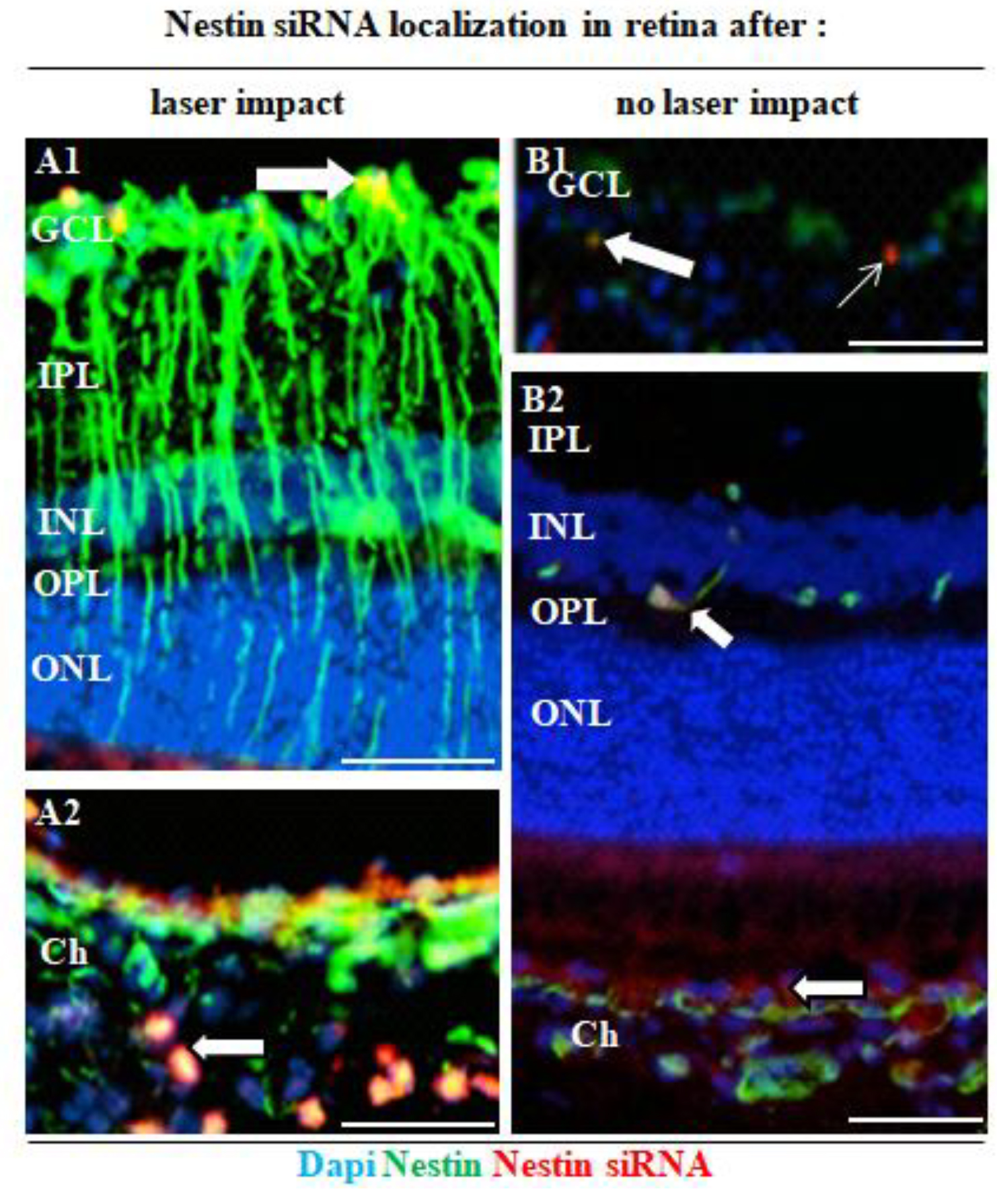 GCL (rightward thick arrow) and A2: choroid (leftward thick arrow). In the control retina (retina without laser impact), nestin siRNAs were occasionally observed