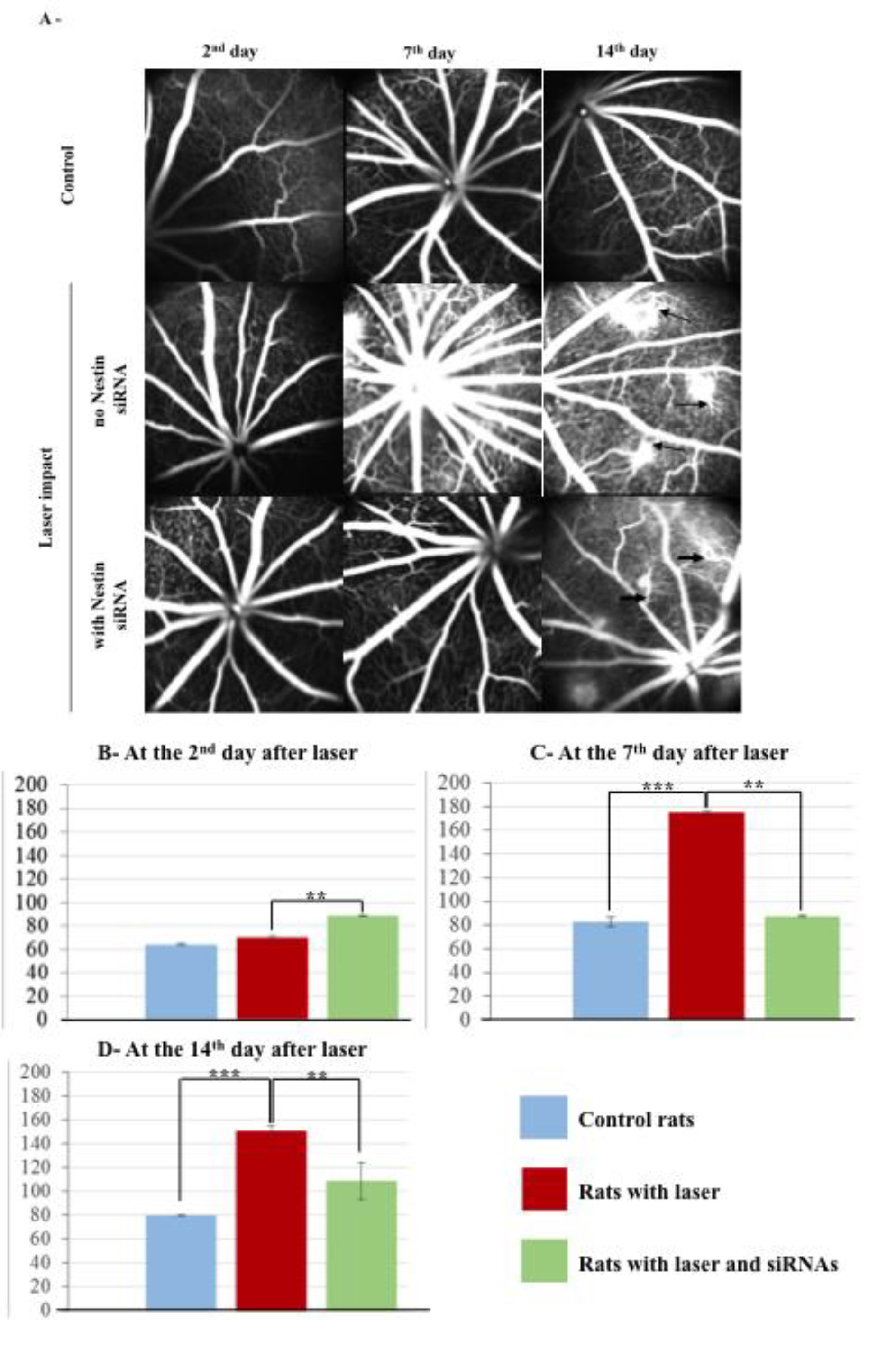 Figure 9. Changes in choroidal vascularization after the laser impacts and nestin siRNA injection. A: No apparent changes in vascularization was observed in the control animals during the experimental period (upper panels).