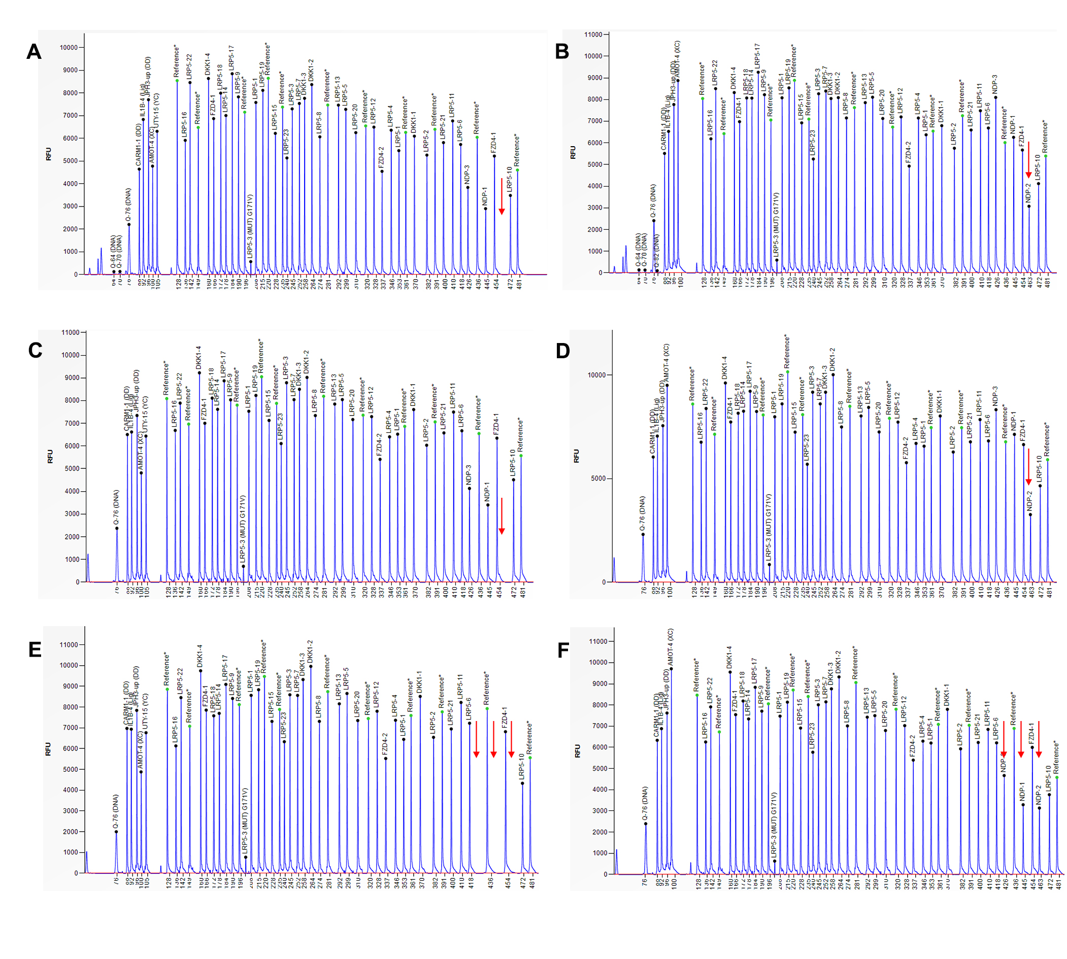 Figure 4. Confirmation of NDP copy number variations (CNVs) using multiplex ligation-dependent probe amplification (MLPA). A: MLPA analysis of XDW1 (left) and XDW1M (right). The arrow indicates no peak in XDW1 and a half-reduced relative peak height