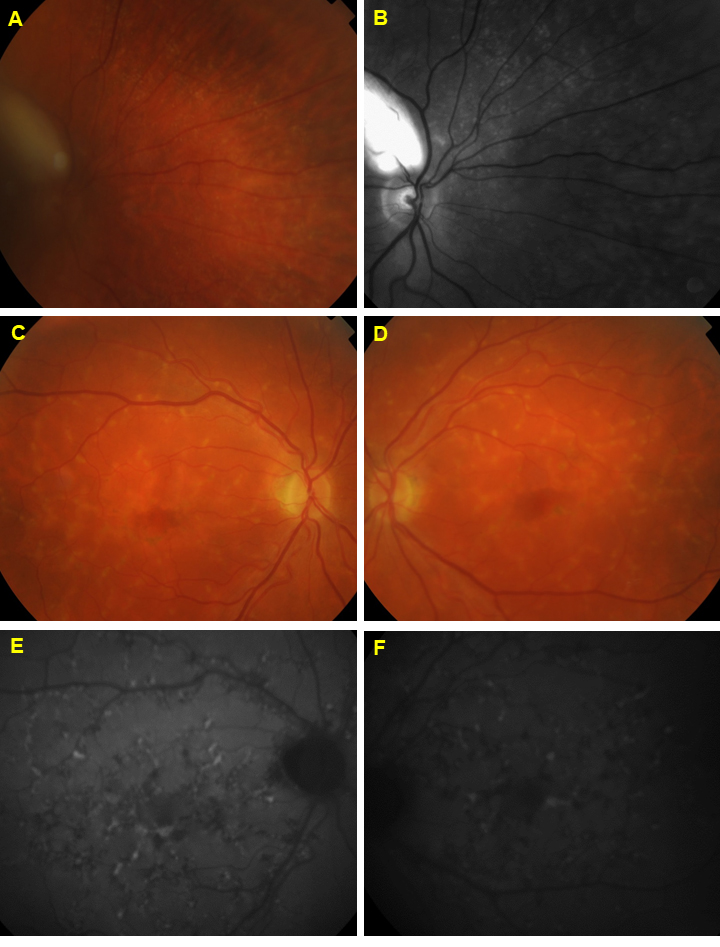 Figure 3. Fundus images. A–D: Fundus photographs. E and F: Fundus autofluorescence (FAF) images. The fundus photographs of Subject 1, both A: color and B: red-free, demonstrate small drusen scattered outside and inside the vascular arcades. The images also show myelinated retinal