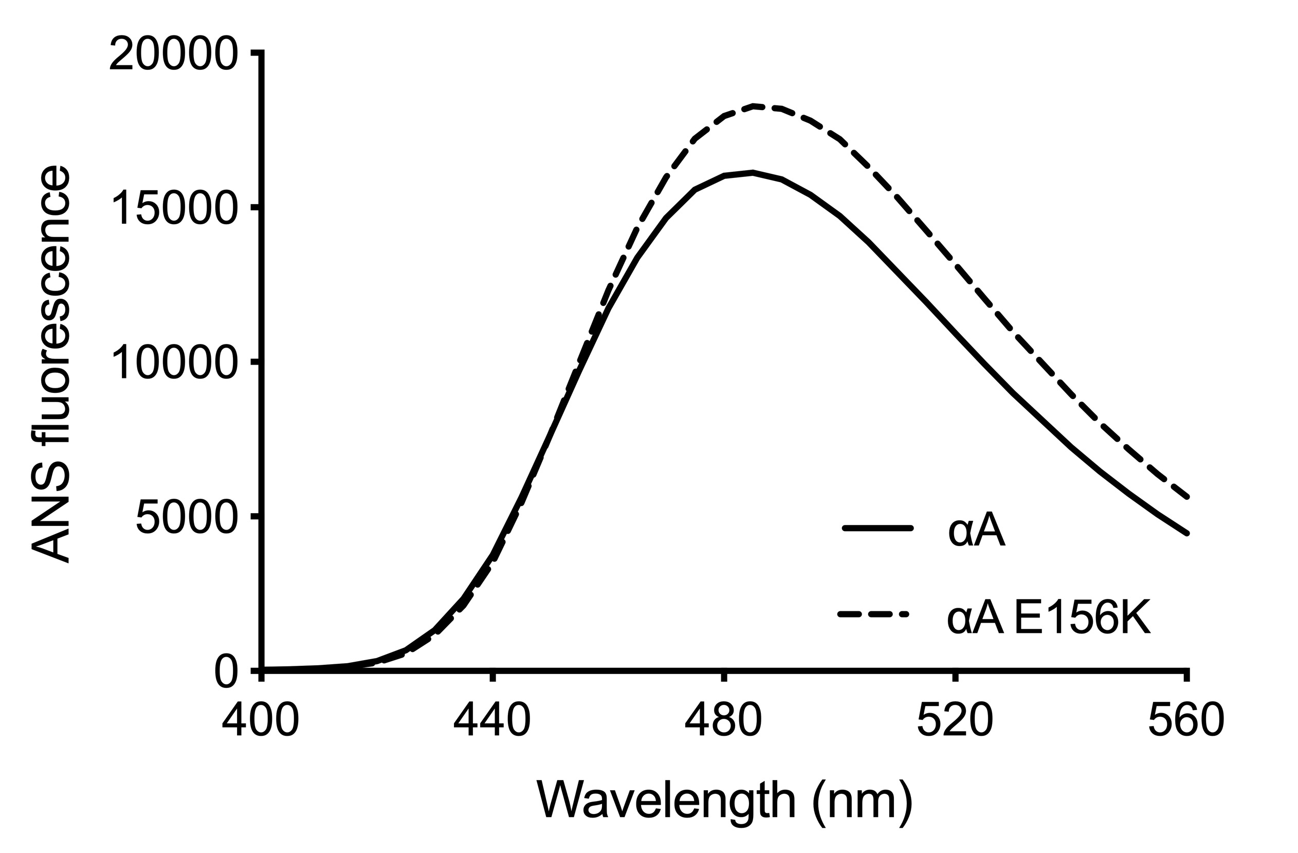 ANS fluorescence spectra of wild-type (solid curve) and E156K mutant (dashed curve).