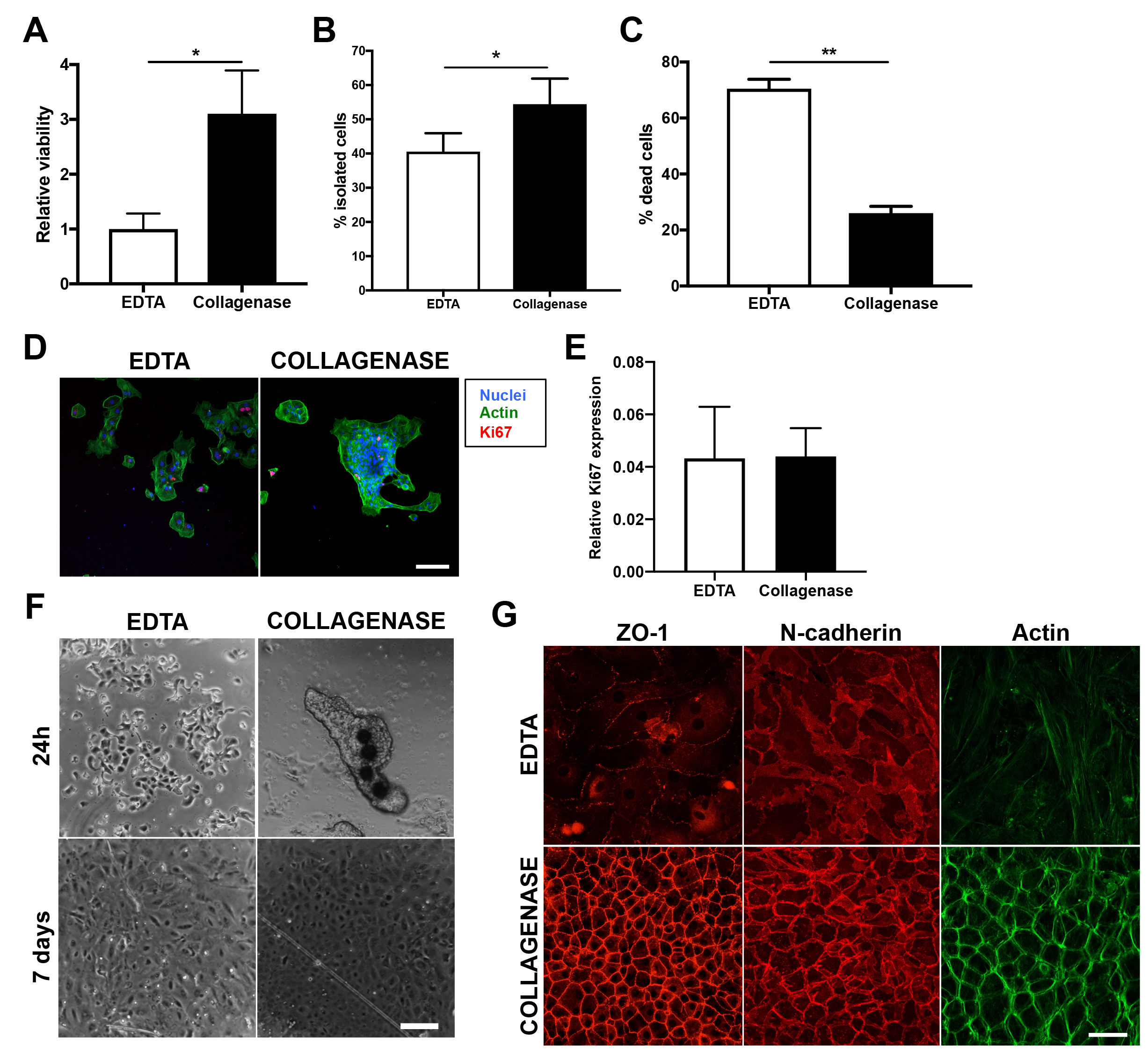 Figure 1. Primary (P0) cultures of corneal endothelial cells isolated with EDTA or collagenase A. A: Cell viability, 2 h after cell isolation, relative to the EDTA condition. n = 6. B: Percentage of cells isolated from native Descemet membranes. n = 4. C: Percentage of dead cells immediately following cell isolation from Descemet membranes. n = 4. D: Representative images of indirect immunofluorescence staining of Ki67 (red), actin (green), and nuclei (blue) at 24 h postseeding.