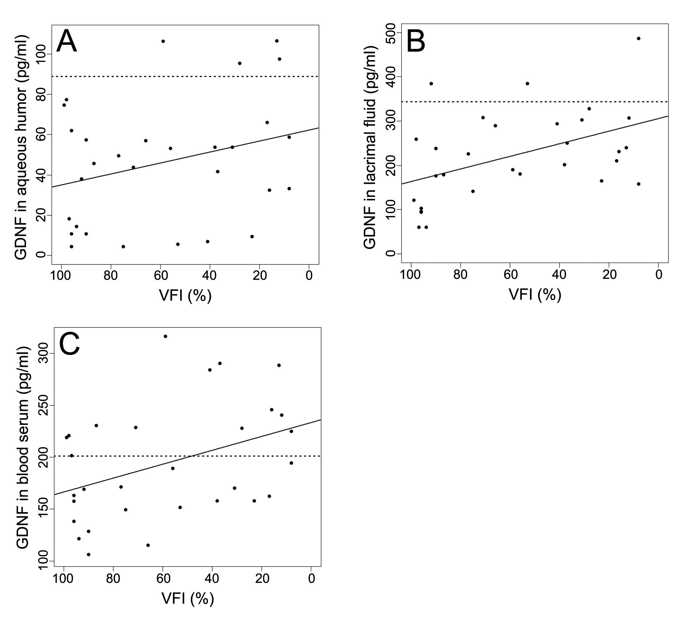 Figure 1. Plots of GDNF content in aqueous humor (A), lacrimal fluid (B), and blood serum (C) versus the Humphrey visual field index (VFI) in the main group. The solid line represents the linear regression fit. Note