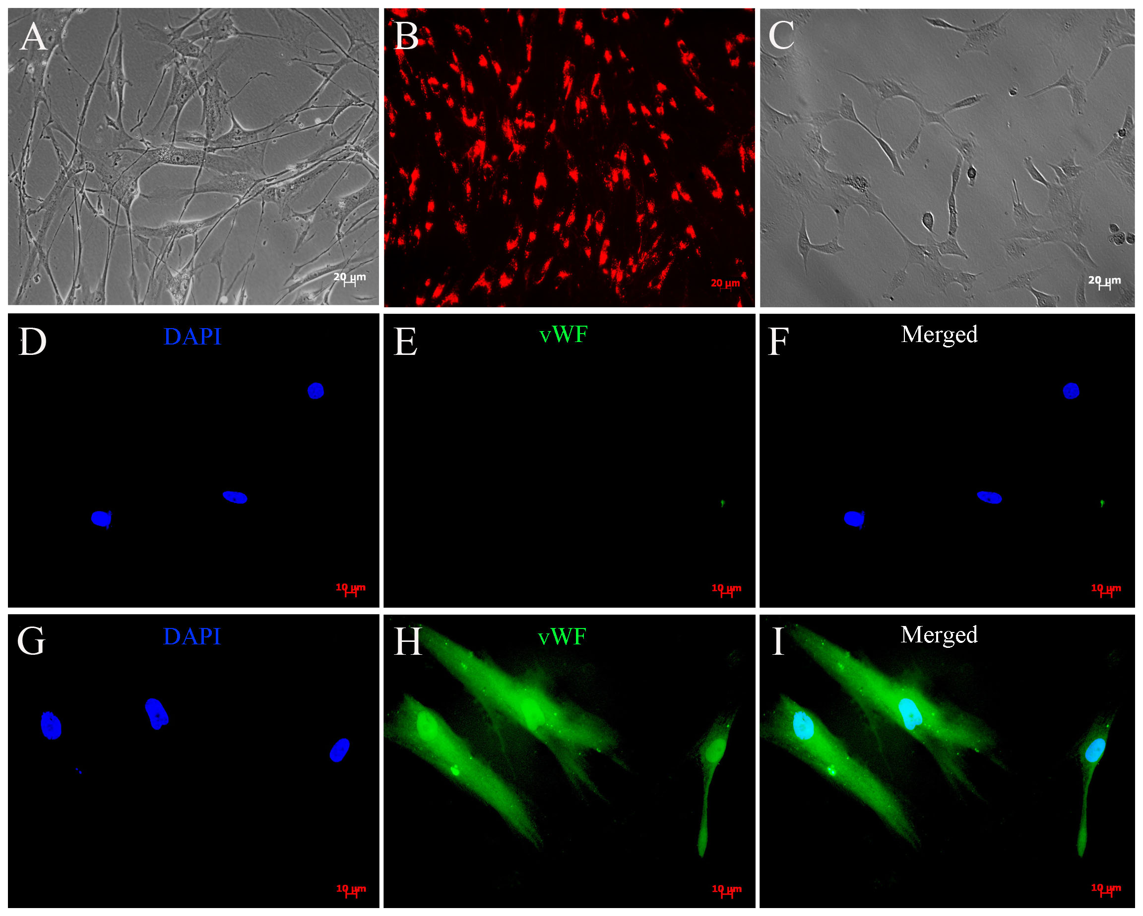 Figure 1. Culture, labeling, and immunofluorescence staining of hADSCs. A: In the second passage, the human adipose mesenchymal stem cells (hADSCs) show spindle and polygonal shapes. B: The membrane of the hADSCs shows red fluorescence, and the nucleus shows no fluorescence. C: After induction, the corners of the hADSCs appear rounded. D, E, F: The expression of von Willebrand Factor (vWF) is absent (no fluorescence) in the control group. G, H, I: The expression of vWF is present (green fluorescence) in the experimental group. The nuclei stained with 4′,6-diamidino-2-phenylindole