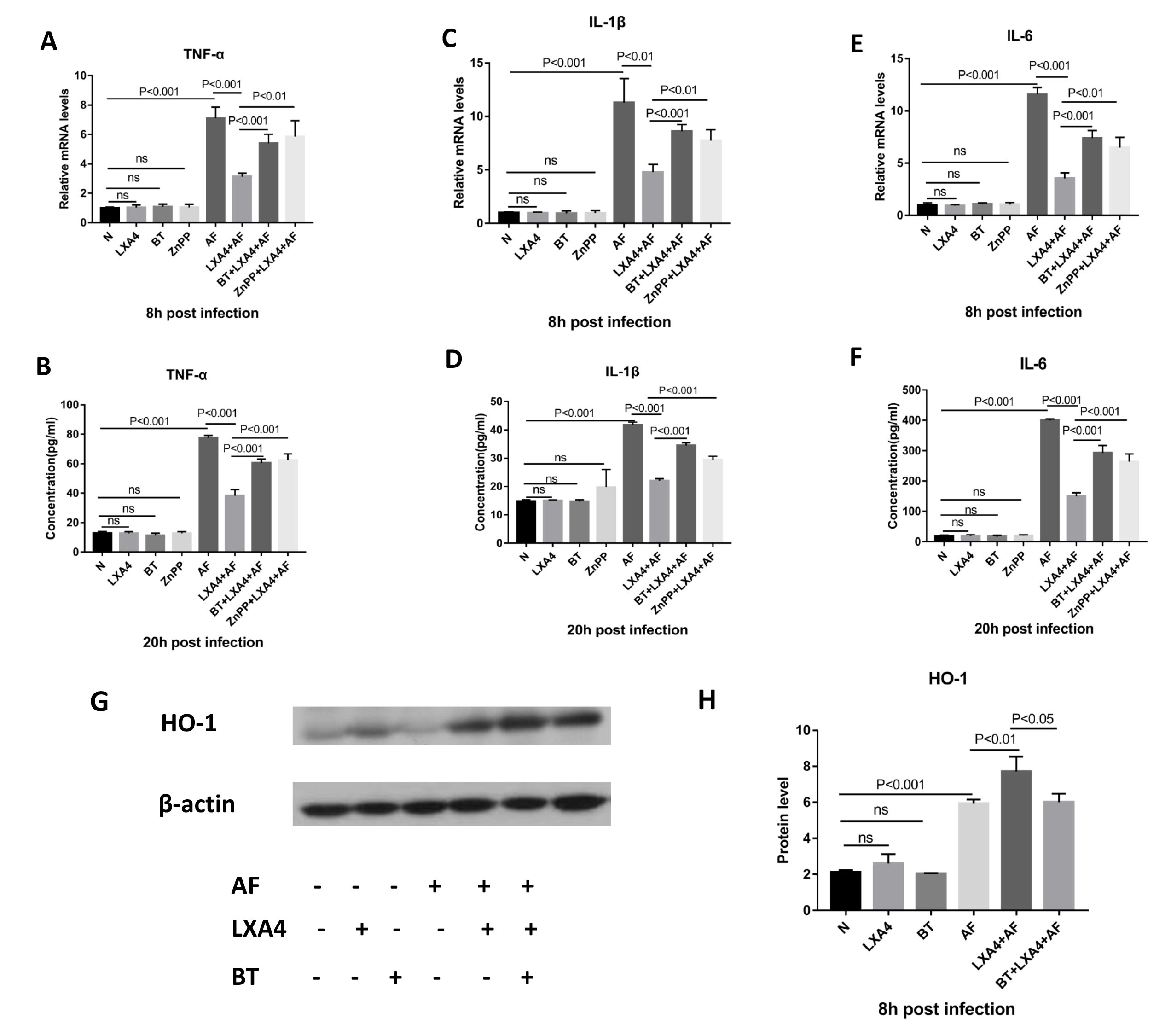 increment of HO-1 protein level elicited by LXA4 was suppressed at 8 h post-infection by G,H: BT pretreatment. All data are presented as mean ± SD and evaluated by an unpaired, two-tailed Student t test (ns: no significance).