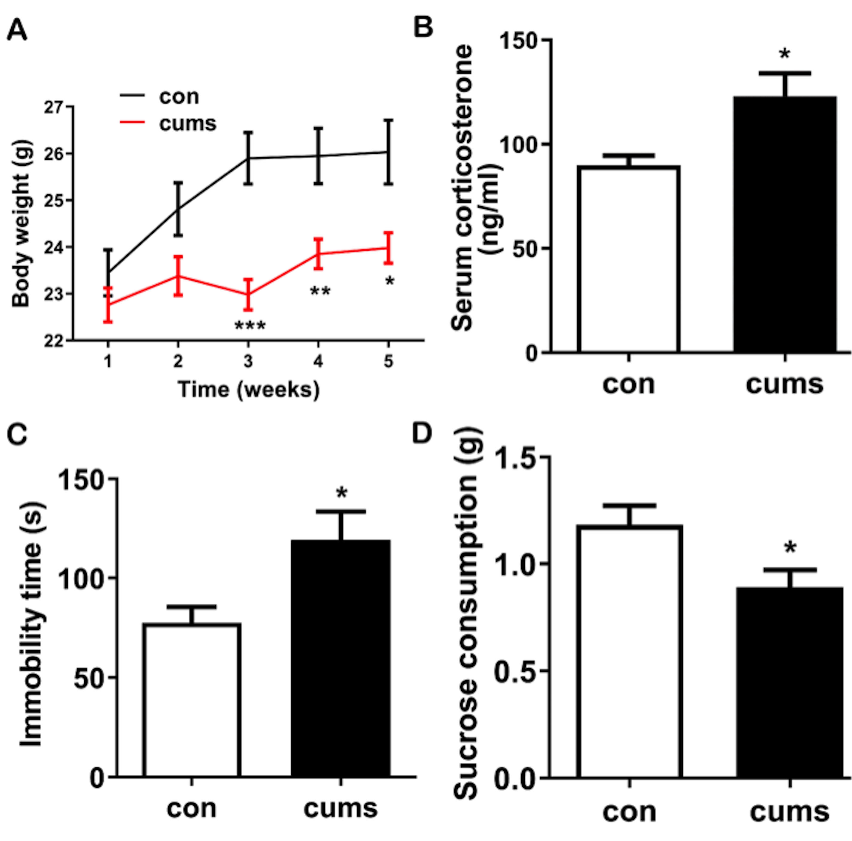 Figure 1. Chronic unpredictable mild stress (CUMS) mice presented depression-like behaviors and reduced weight gain. A: Bodyweight was measured weekly for both groups. CUMS mice gained weight more slowly than control mice did. The mice exposed
