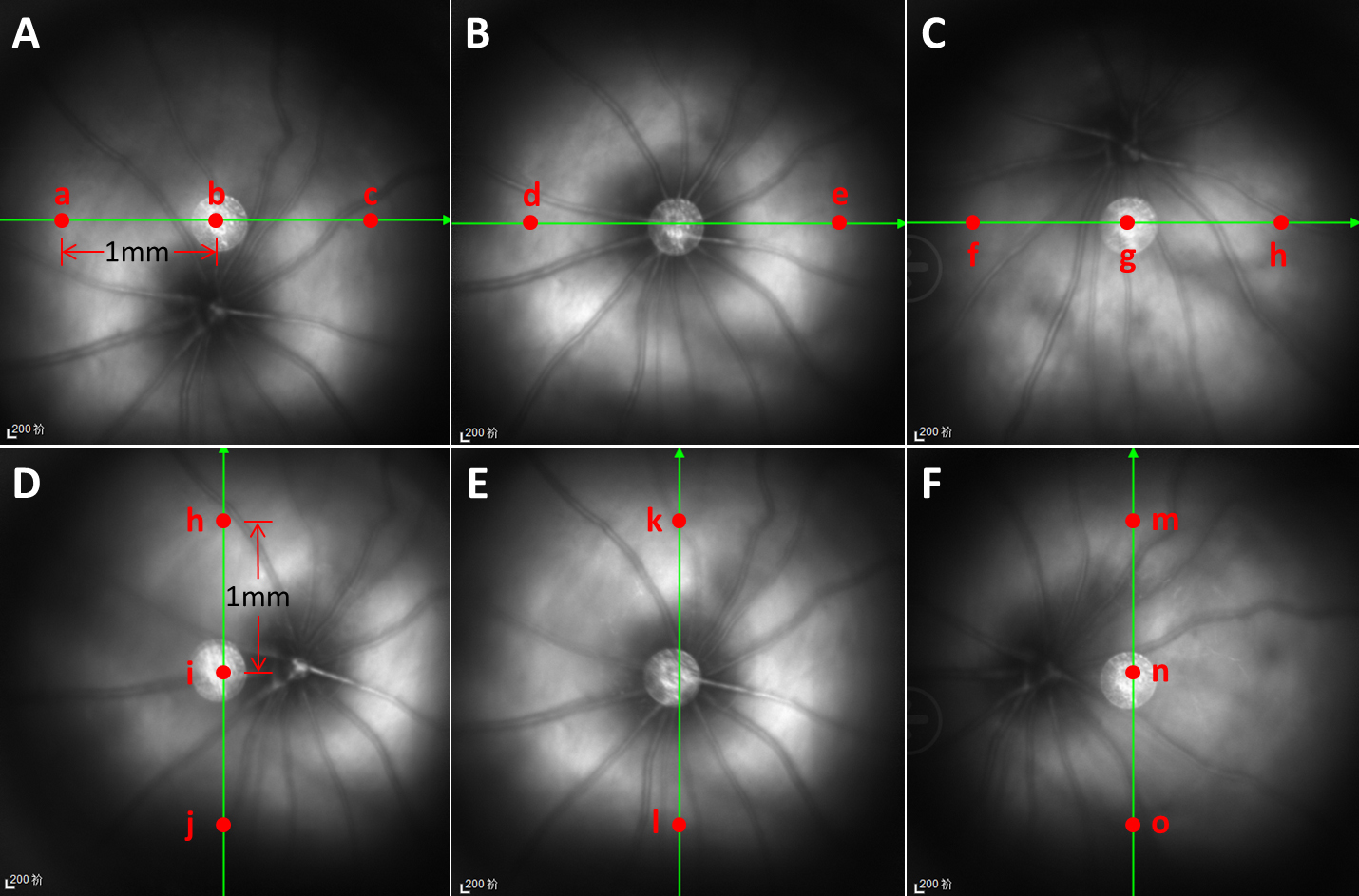 Figure 1. Retina scanning positions and retinal thickness measurements during OCT examination. Panels A–C show scanning images of the x-axis; panels D–F show scanning images of the y-axis. B and E show x-axis and y-axis OCT scanning through the discus opticus alone. A and C show x-axis scanning at a distance of 0.5 PD upwards and downwards from the discus opticus. D and F show y-axis scanning at a distance of 0.5 PD rightward and leftward from the discus opticus. Red points indicate the locations