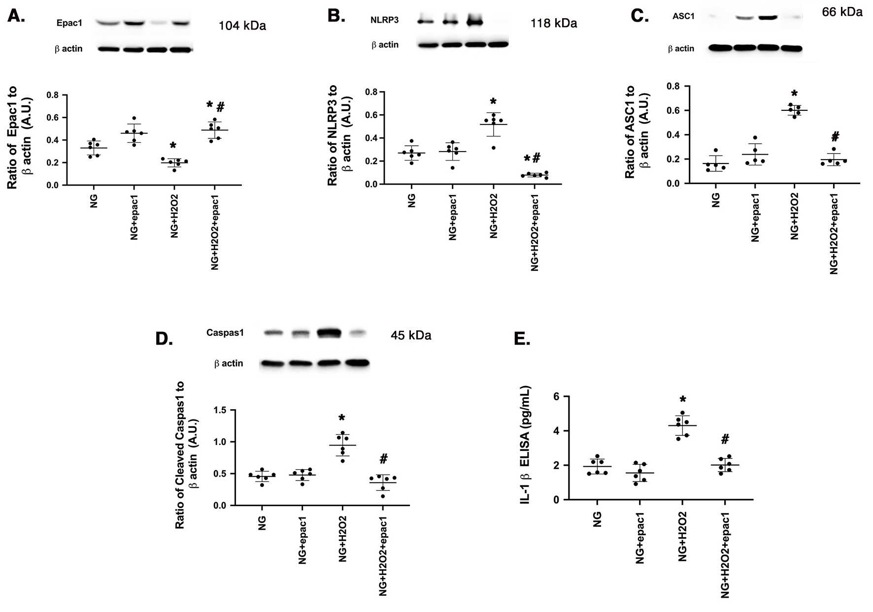 cells (RECs) grown in normal glucose (NG) and treated with H2O2 or an Epac1 agonist (Panel A). Panels B–D are Western blot results for NLRP3 (B), ASC1 (C), and cleaved caspase 1 (D). Panel