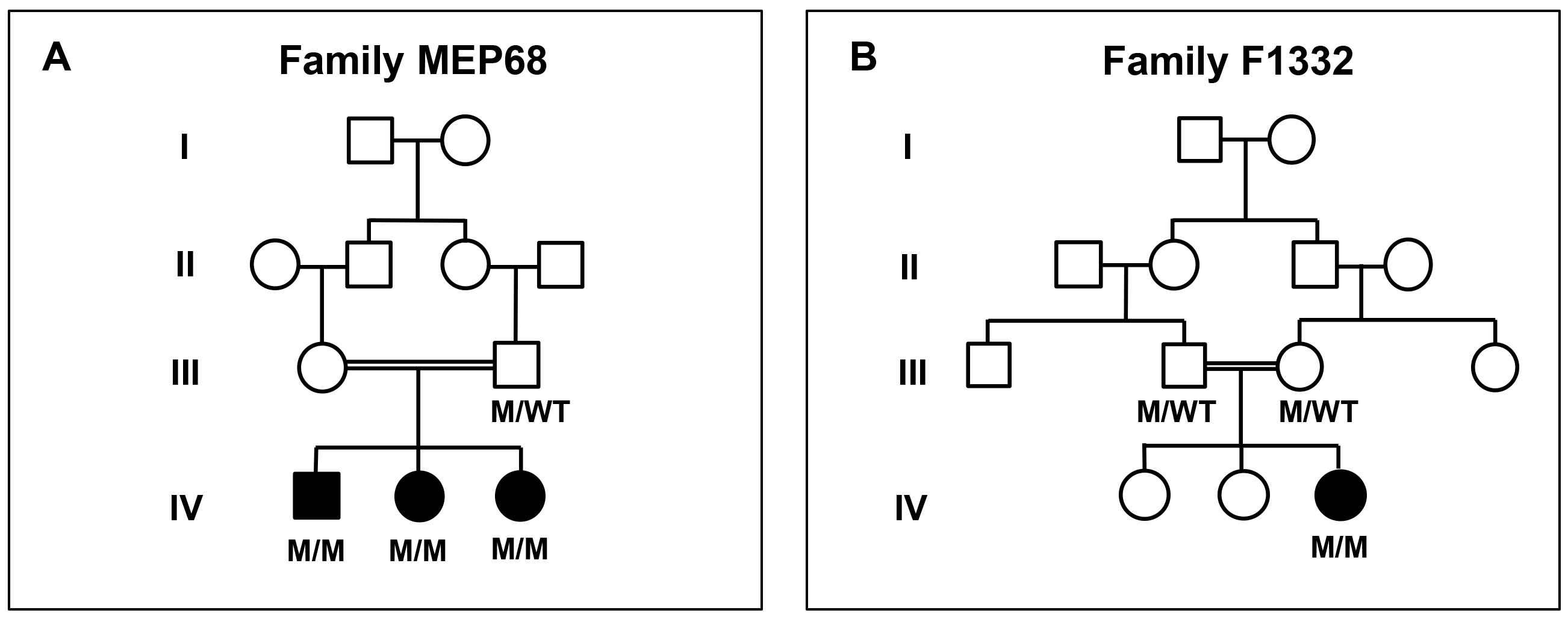 Figure 1. Pedigrees of the two families with affected members who have poor vision due to anterior eye abnormalities. A: Family MEP68. B: Family F1332. The genotypes for all tested family members from whom DNA was available are shown below each individual. M/M