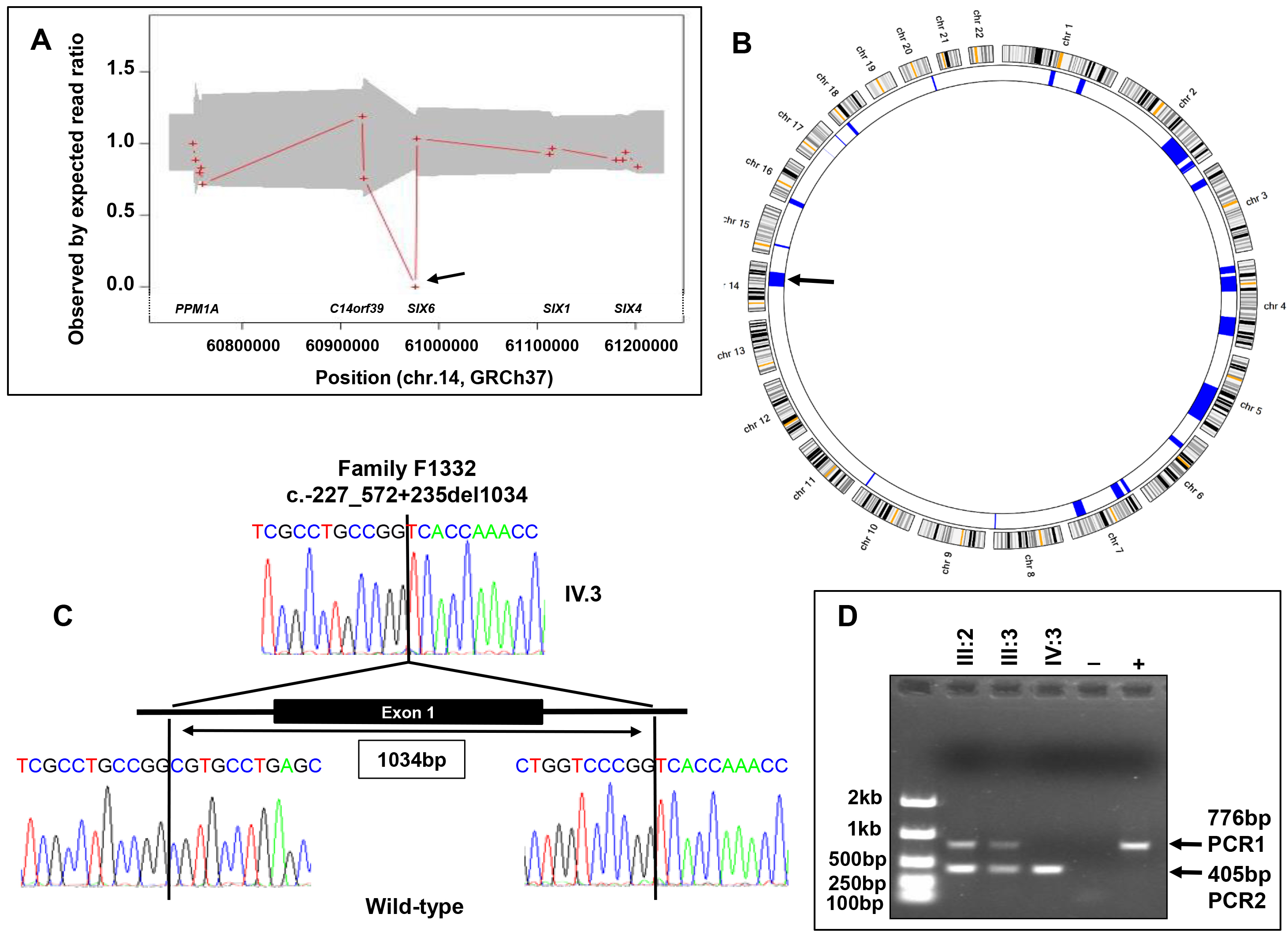 Figure 4. Genetic analysis of family F1332. A: ExomeDepth analysis of the proband’s exome sequence data around the SIX6 locus. The ratio of the observed (patient’s exome data) to expected (seven unrelated control exomes) number of reads for