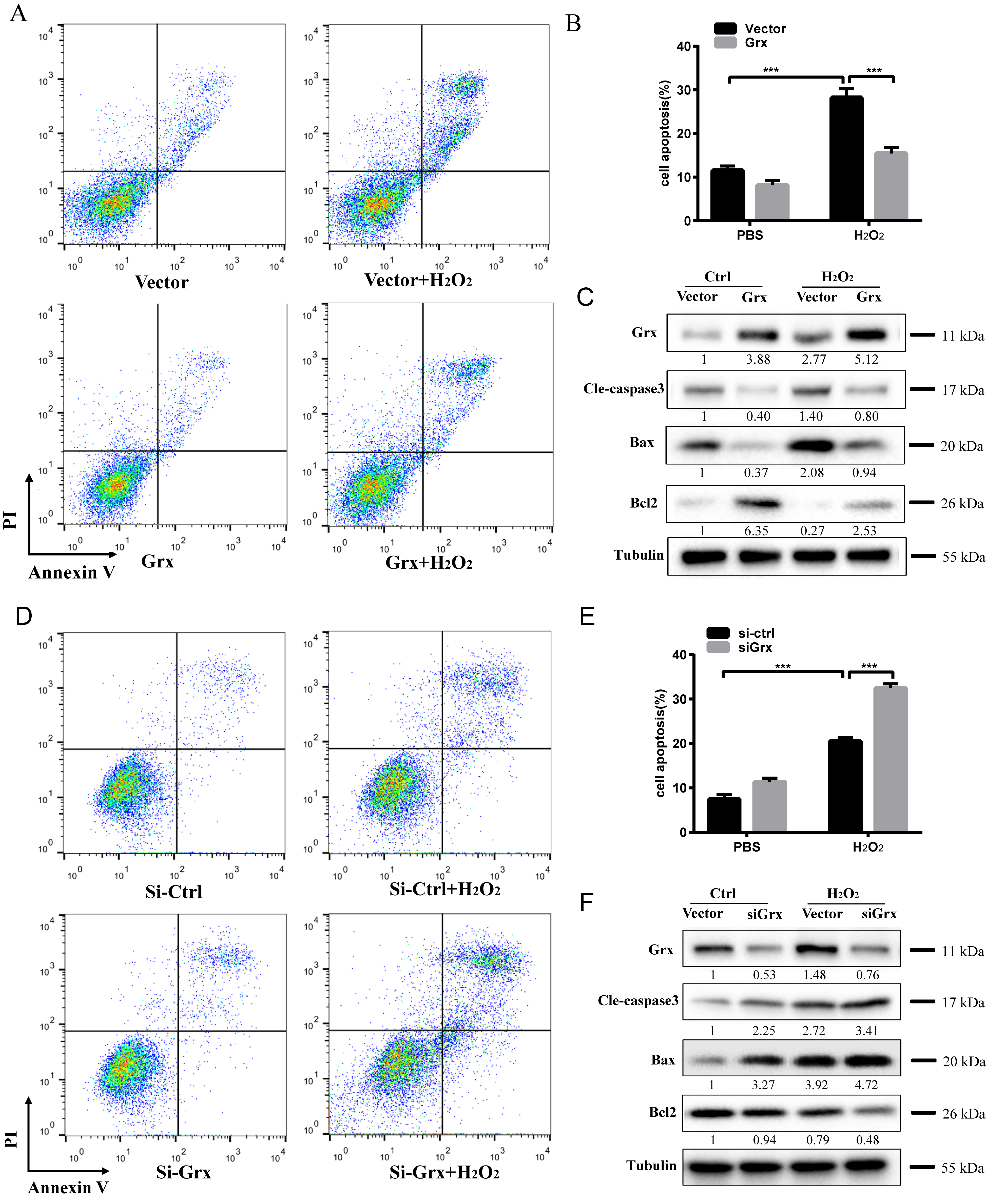 Figure 4. Effect of Grx on cell apoptosis. A, D: Flow cytometry analysis of HLE cells following treatment with 200 μM H2O2 for 24 h after Grx overexpression (A) and knockdown (D). Early/primary apoptotic cells (Annexin V+/PI−), late/secondary apoptotic cells (Annexin V+/PI+), and necrotic cells (Annexin V−/PI+) were distinguished. B, E: Percentage of apoptotic cells following treatment with 200 μM H2O2 for 24 h after Grx overexpression (B) and knockdown (E) in HLE cells. C, F: Western blot analysis of Bax/BCL2/Cle-caspase3 expression in HLE cells following treatment with 200 μM H2O2 for 24 h after Grx overexpression (C) and knockdown (F). The quantitative statistical results of the western blot band intensity are labeled under the corresponding western blot
