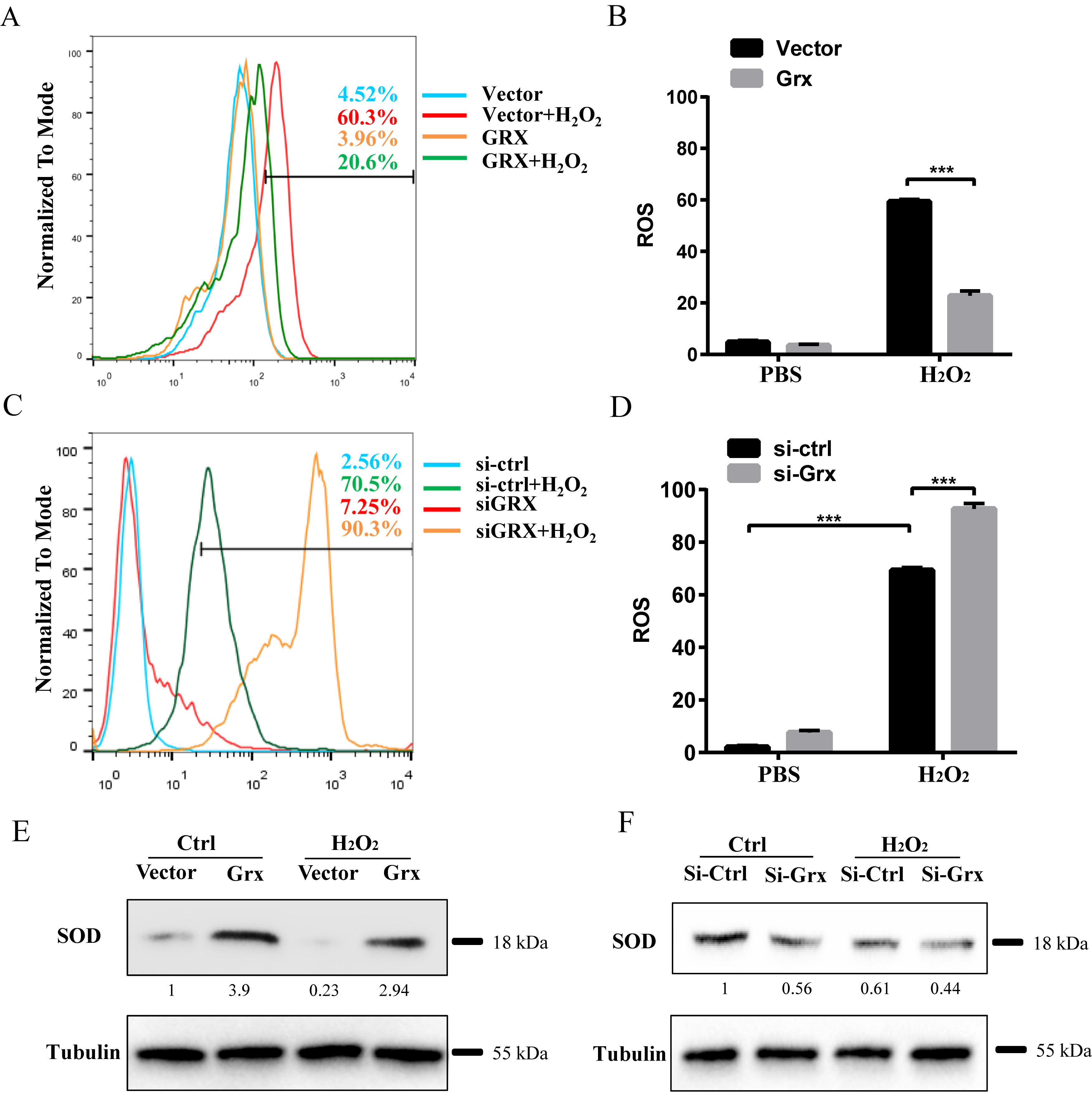 Figure 5. Effect of Grx on intracellular ROS generation. A, C: Histograms of intracellular ROS levels in HLE cells following treatment with 200 μM H2O2 for 24 h after Grx overexpression (A) and knockdown (C). B, D: Bar graph analyses of the median fluorescence intensities of HLE cells following treatment with 200 μM H2O2 for 24 h after Grx overexpression (B) and knockdown (D). E, F: Western blot analysis of SOD expression in HLE cells following treatment with 200 μM H2O2 for 24 h after Grx overexpression (E) and knockdown (F). The quantitative statistical results of the western blot band intensity are labeled under the western blot band. *** p < 0.001.