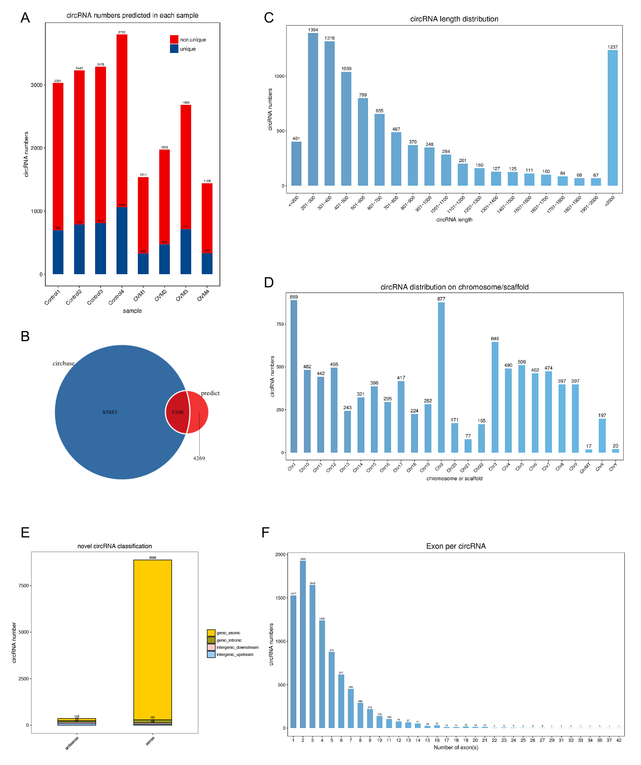 A: The number of identified circRNAs in OVM (OVM1, OVM2, OVM3, and OVM4) and normal orbital vascular tissues (Control1, Control2,