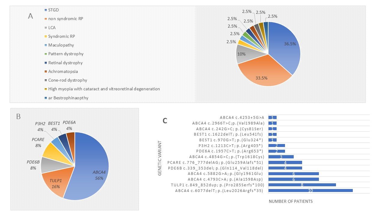 Figure 1. Phenotypic and genotypic findings for the study’s cohort of Ethiopian Jewish patients with IRD. A: Phenotypic distribution. RP = retinitis pigmentosa; STGD = Stargardt disease; LCA = Leber congenital amaurosis; ACHM = achromatopsia; CRD = cone-rod dystrophy. B: Distribution of mutated genes. C: Distribution of variant types.