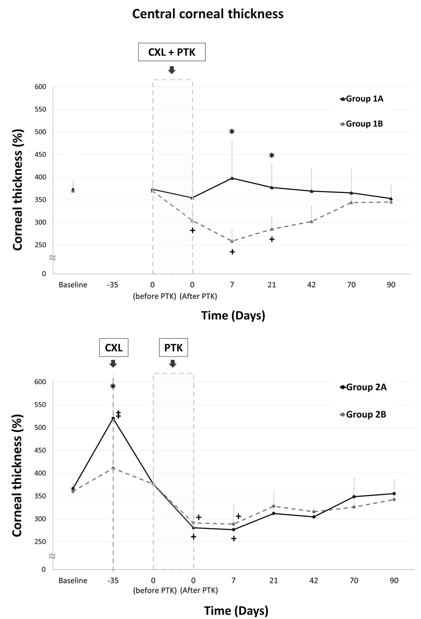 CCT after CXL was significantly (*) thicker than in controls in both Groups 1 and 2 at the indicated time points. The CCT