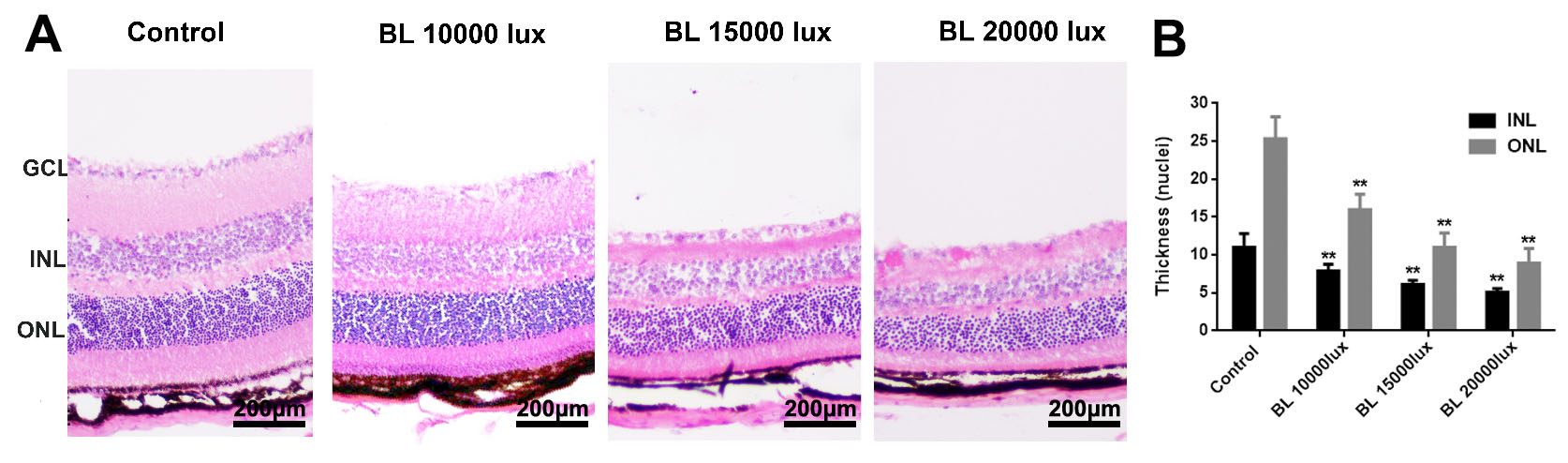 intensities of blue light (10,000, 15,000, and 20,000 lux) for 5 days (8 h/day), and hematoxylin–eosin (HE) staining was used