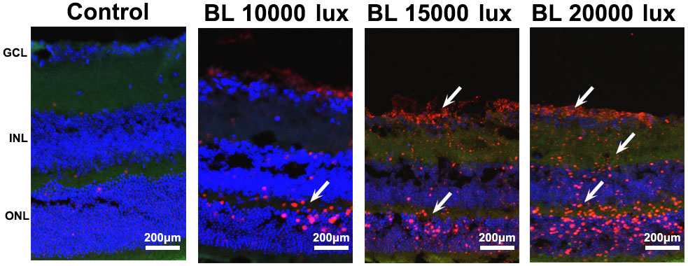 intensities of blue light (10,000, 15,000, and 20,000 lux) for 5 days, and terminal-deoxynucleotidyl transferase 24 (TdT)-mediated
