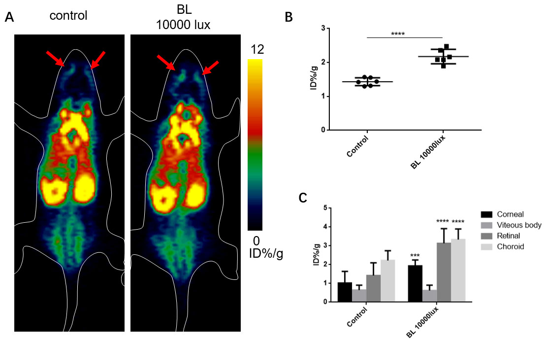 Figure 4. PET images of [18F]-DPA-714 were used to evaluate the systemic inflammatory state of blue light–injured mice. A: Micro-positron emission tomography (PET) whole-body image of the control and blue light–damaged mice. B: Blue light–damaged mice average ID%/g of eyeballs. ****p<0.0001 versus control group. C: Biodistribution of the cornea, vitreous body, retina, and choroid was assessed by analyzing the mean ID%/g. ***p<0.001, ****p<0.0001 versus the control group.
