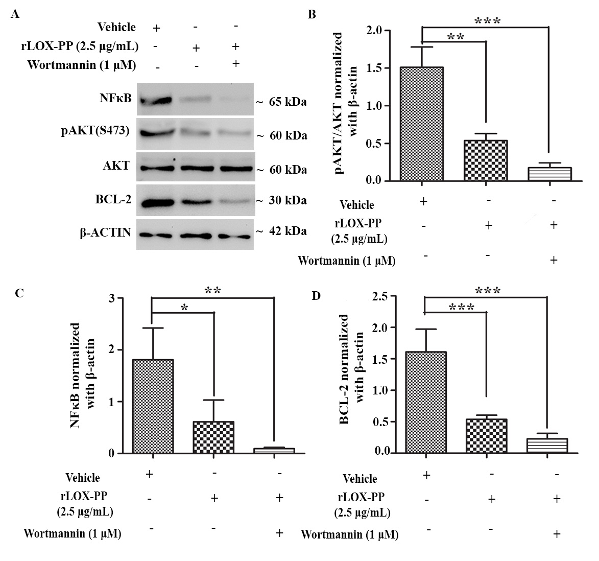 of recombinant LOX-PP and 2.5 µg/ml of recombinant LOX-PP + 1 μM wortmannin. B: The representative bar diagram shows the quantification of pAKT normalized with β-actin. C: The representative bar diagram shows the quantification of NFκB normalized with β-actin. D: The representative bar diagram shows the quantification of BCL-2 normalized with β-actin. Values were expressed as mean ±