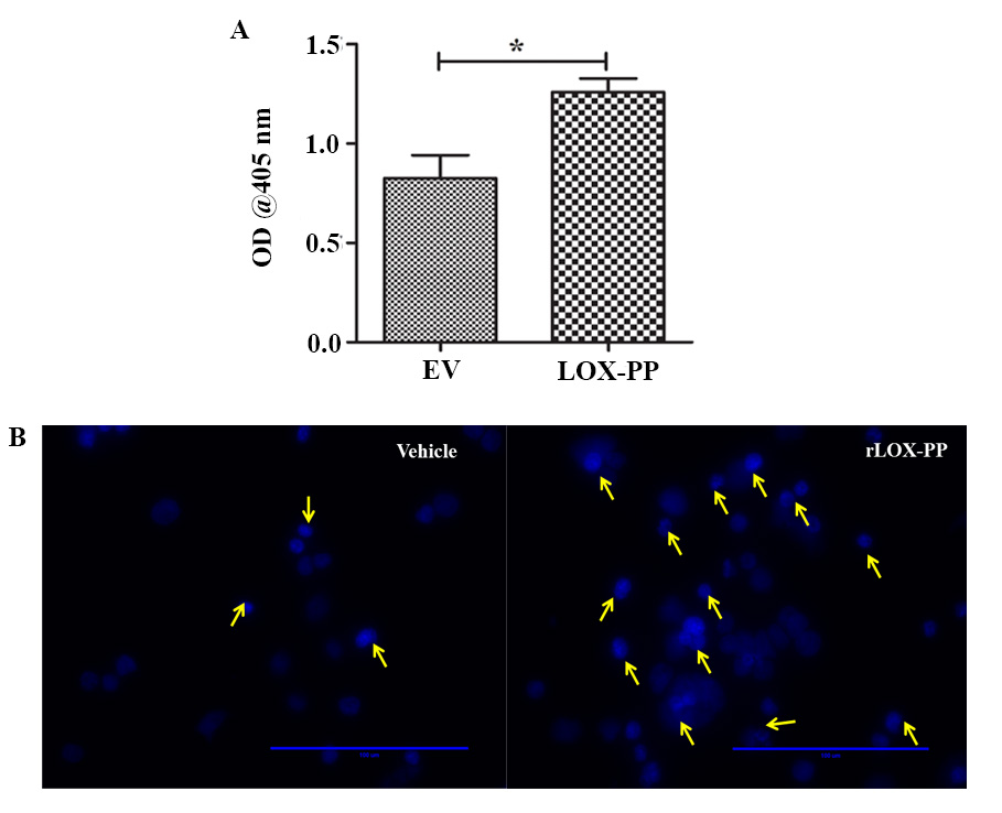 Figure 6. The role of LOX-PP in Y79 cell apoptosis. A: Quantification result of apoptosis by using the cell death ELISA kit. B: Microscopic image of apoptotic cells stained with DAPI upon treatment with rLOX-PP (yellow arrow shows apoptotic cells).