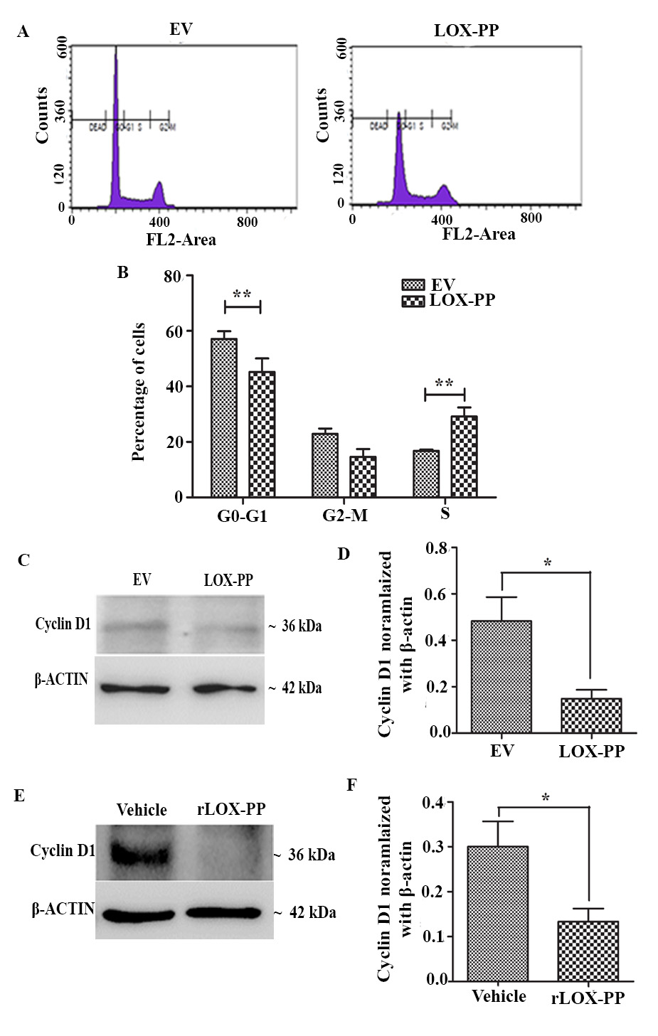 Figure 7. The role of LOX-PP in the cell cycle events in RB. A: Flow cytometric analysis and propidium iodide stain showing the percentage of cells in G2, S, and G1. B: Representative bar diagram of cell cycle analysis. C: Western blot analysis showing the expression of Cyclin D1 in Y79 cells were overexpressed with LOX-PP. D: The bar diagram represents the quantification of Cyclin D1 normalized with β-actin. E: Western blot for Cyclin D1 in Y79 cells upon treatment with 2.5µg/ml of rLOX-PP. F: The bar diagram shows the quantification of Cyclin D1. Values were expressed as mean ± SD, n=3. (Student t test statistical analysis was used; ***p<0.001,**p<0.01, and *p<0.05, when compared with EV and vehicle control) (EV, empty