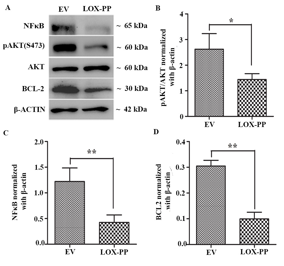 Figure 8. pAKT, NFκB, and BCL-2 protein expression upon LOX-PP overexpression. A: Y79 cells were overexpressed with LOX-PP, and whole-cell protein was extracted and subjected to western blot analysis for