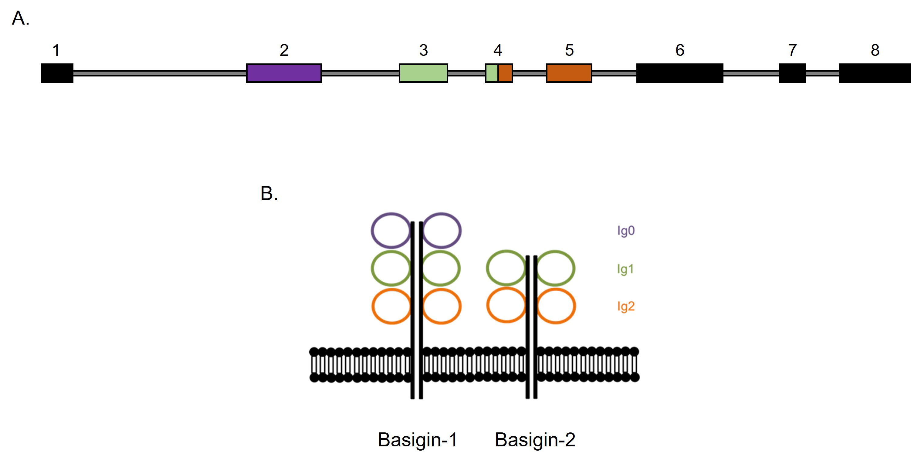 domains. B: An illustration of the protein structures of basigin-1 and basigin-2. Although they are depicted on the same membrane, they