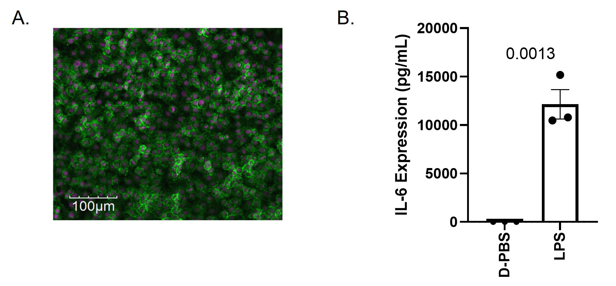 B: Interleukin-6 (IL-6) present within the cell culture medium of RAW 264.7 cells treated with D-PBS or lipopolysaccharide