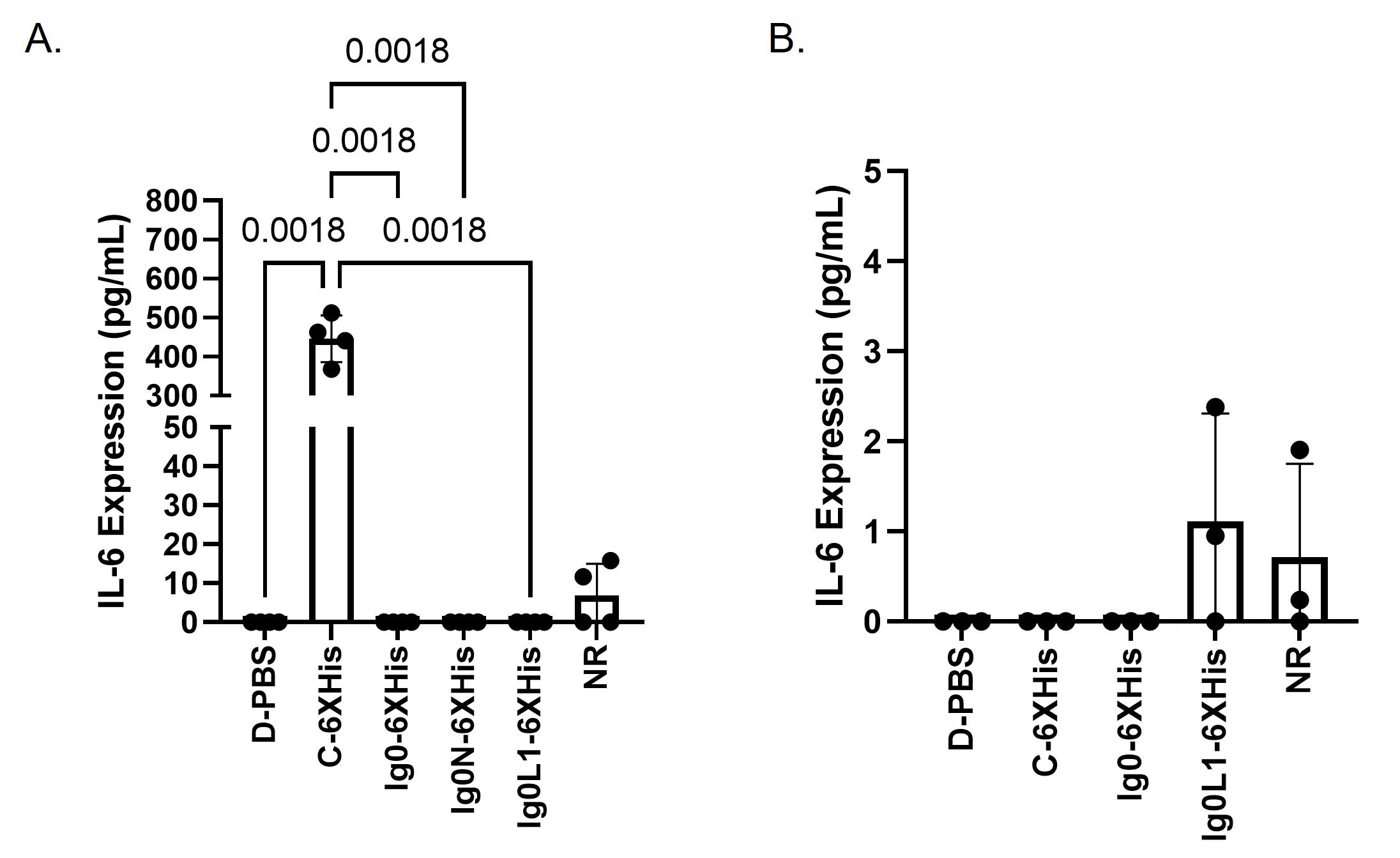 of (A) RAW 264.7 or (B) HEK293–7 cells treated with D-PBS, C-6XHis, Ig0–6XHis, Ig0N-6XHis, or Ig0L1–6XHis recombinant proteins (5 μM) or mouse neural