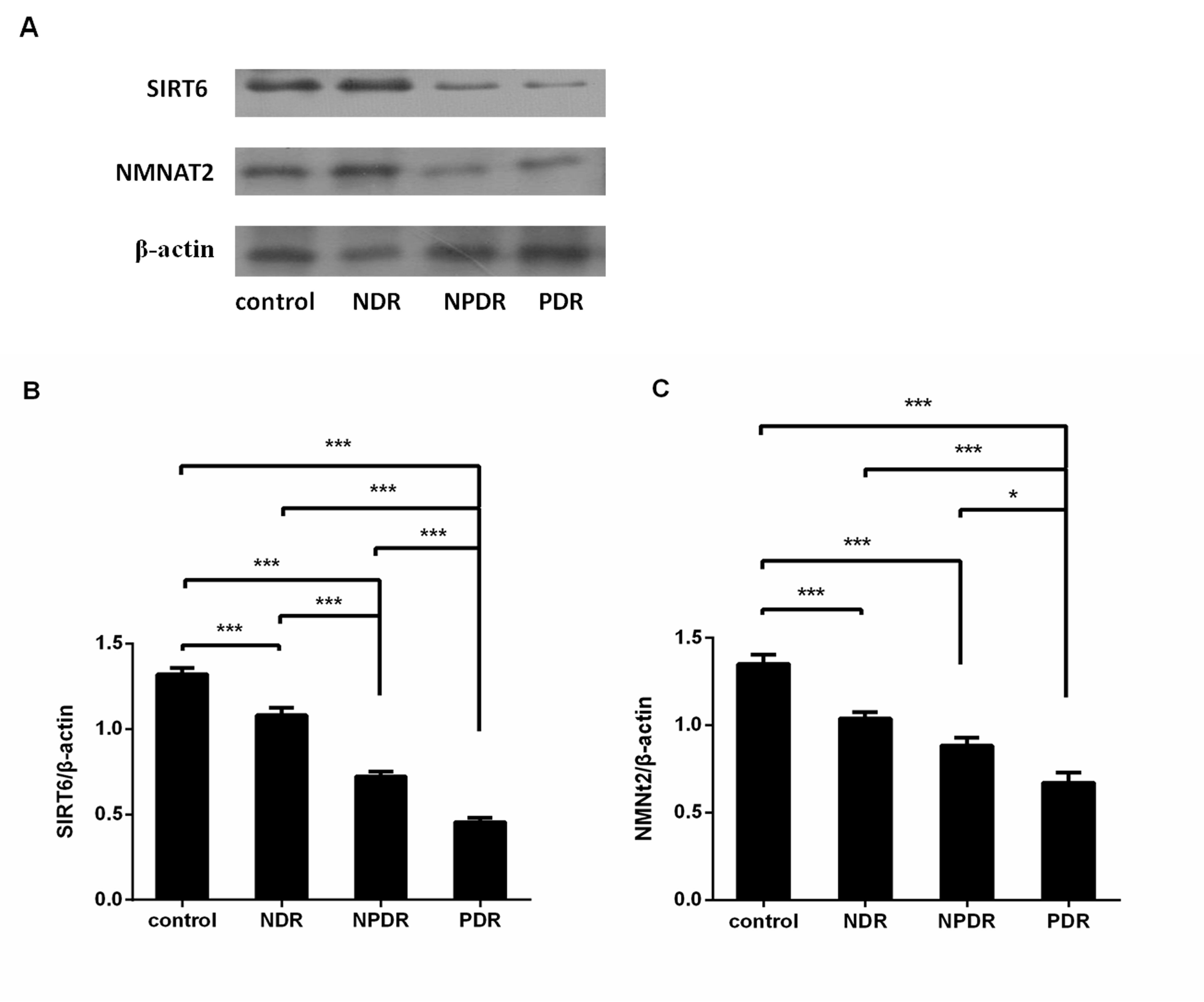 Figure 2. The protein expression of SIRT6 and NMNAT2 was decreased in DR patients (PDR, n = 26; NPDR, n = 26; NDR, n = 25; controls, n = 27). Western blot analysis (lane 1, the control; lane 2, NDR; lane 3, NPDR; lane 4, PDR) and quantification of SIRT6 and NMNAT2 expression in PBMCs. β-actin was included as a reference. *p < 0.05, **p < 0.01, and ***p < 0.001.